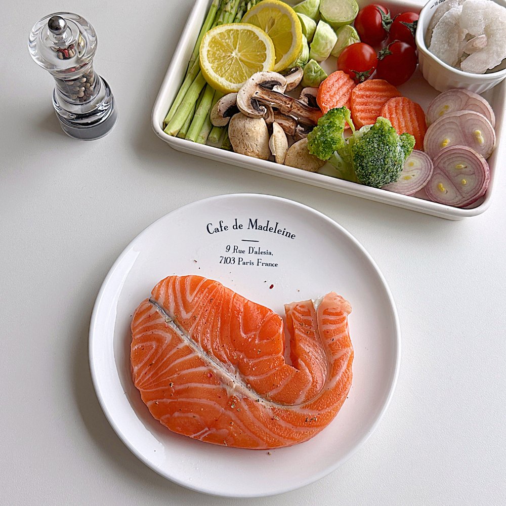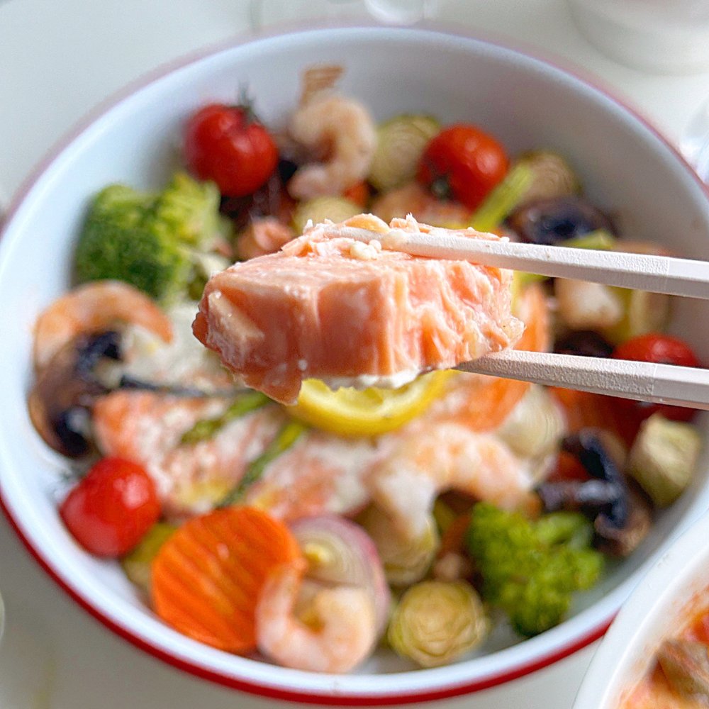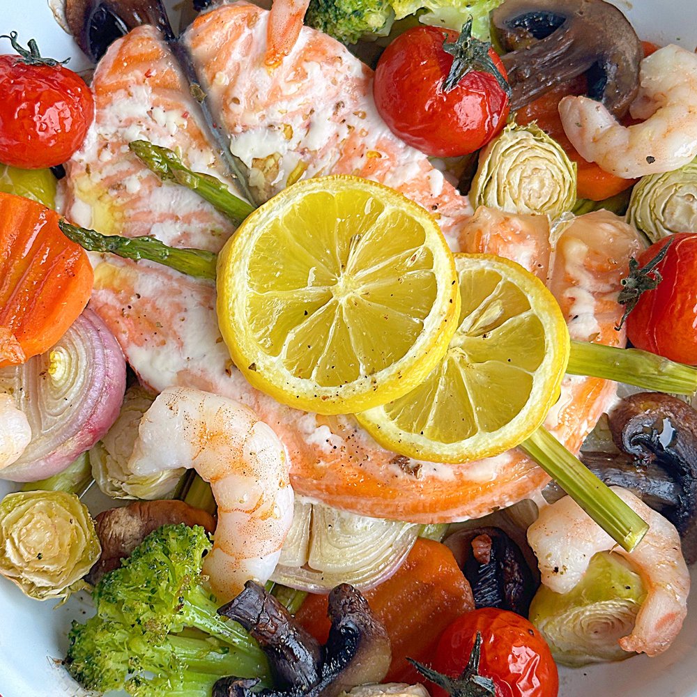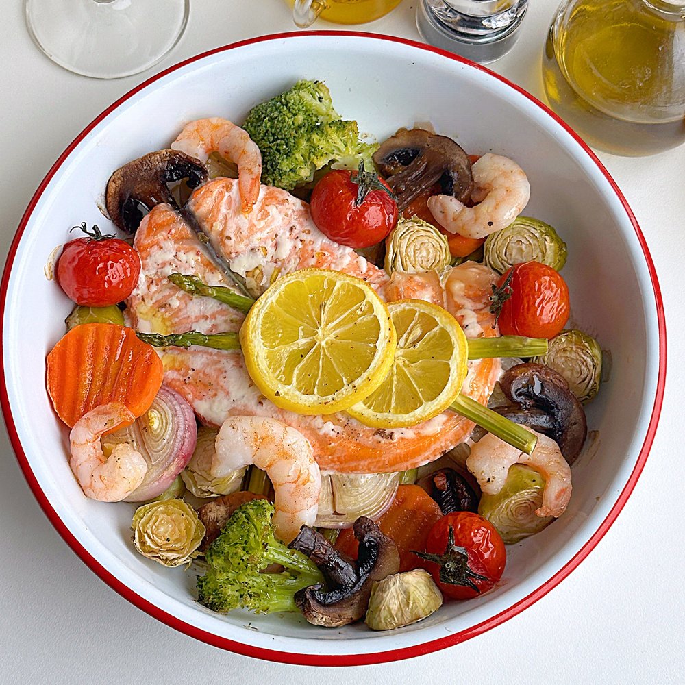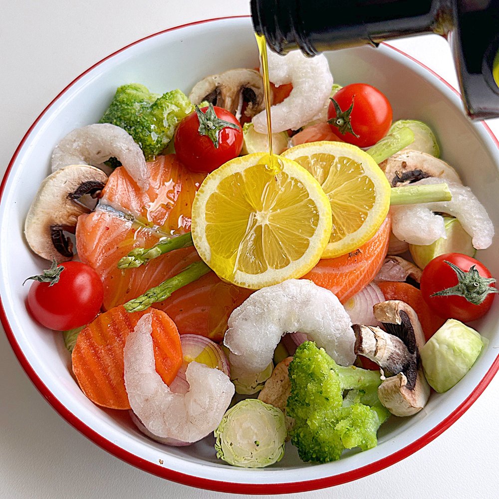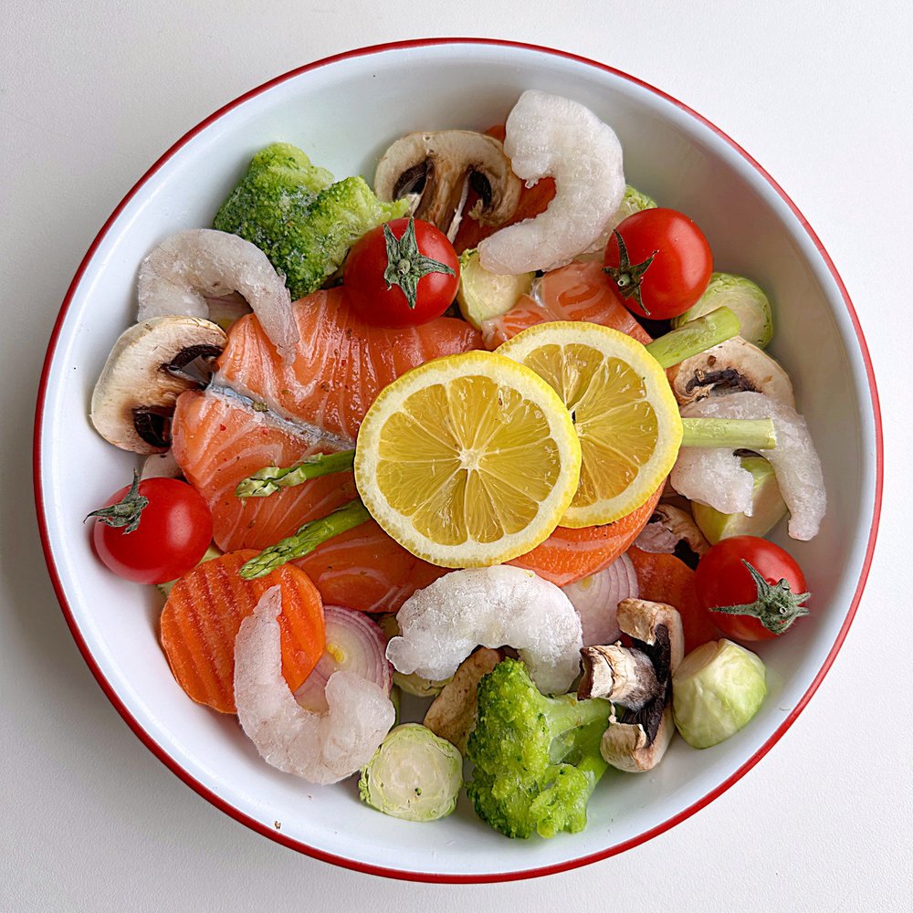 연어, 아스파라거스, 양송이, 미니 양배추, 당근, 브로콜리, 샬롯, 방울토마토, 새우, 레몬