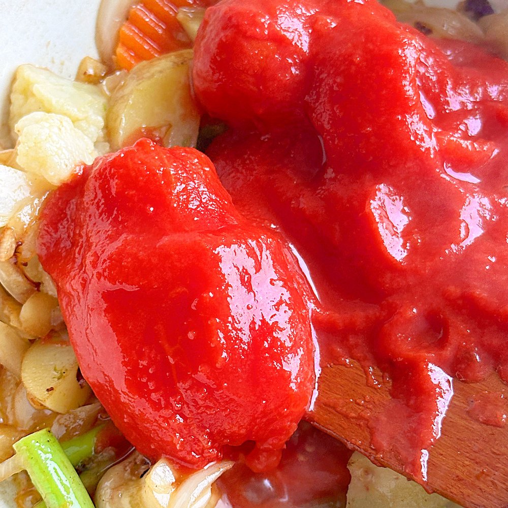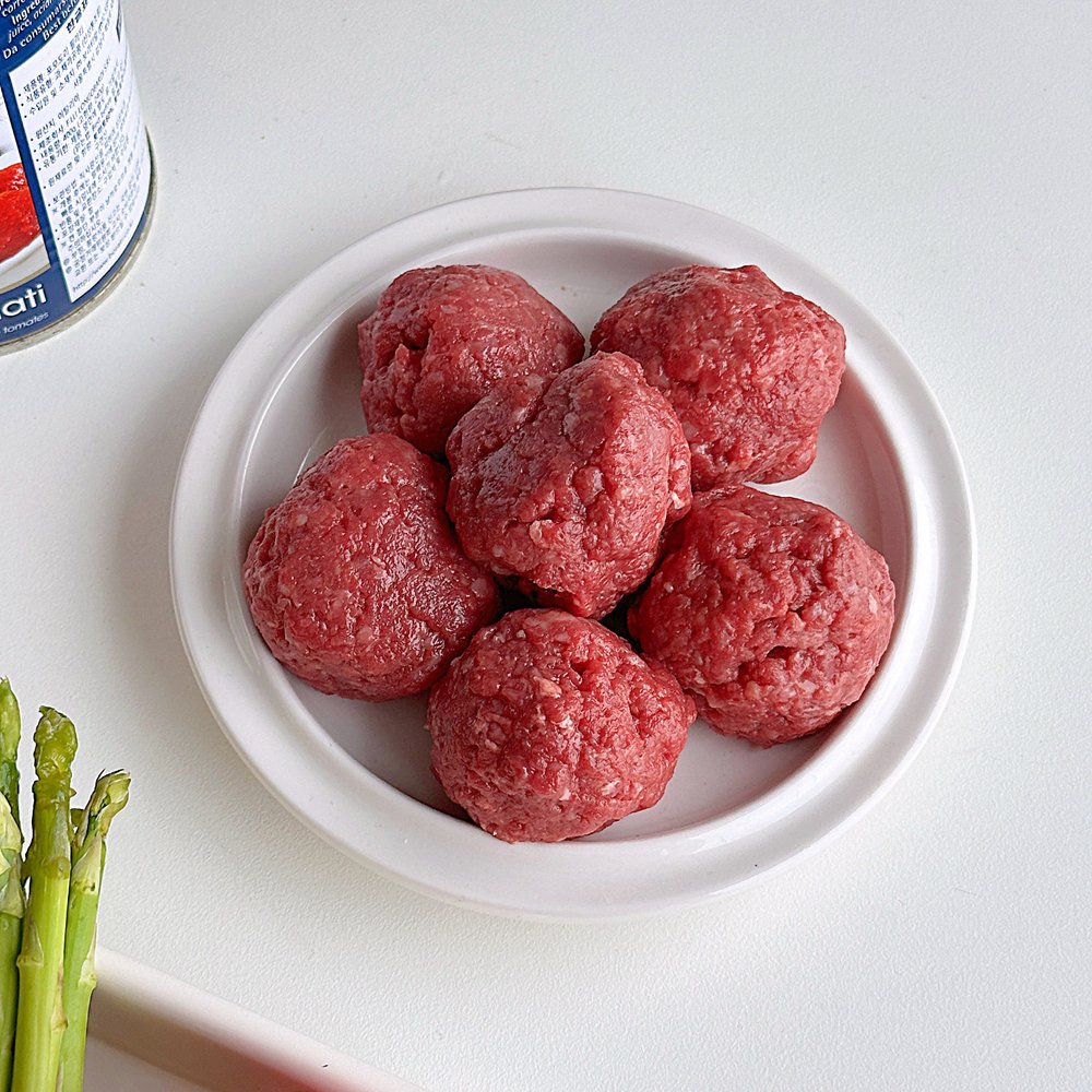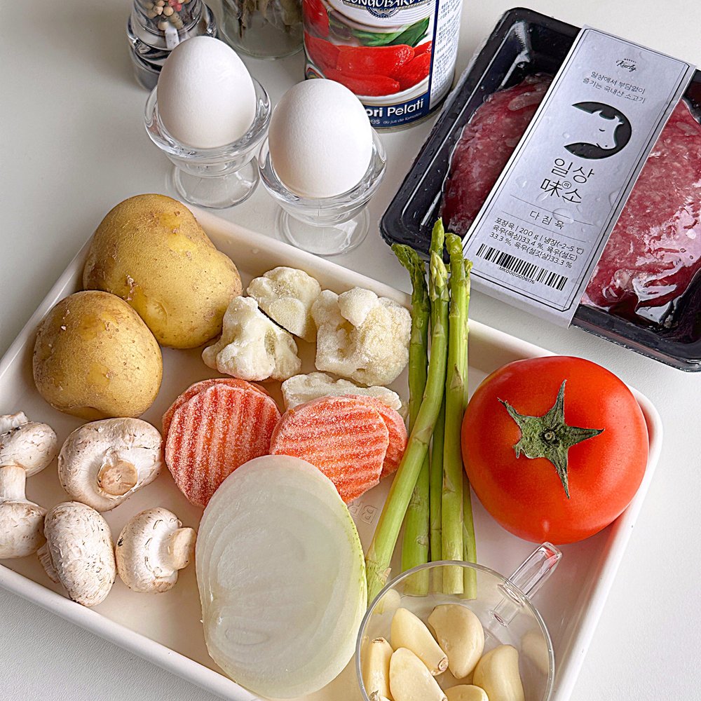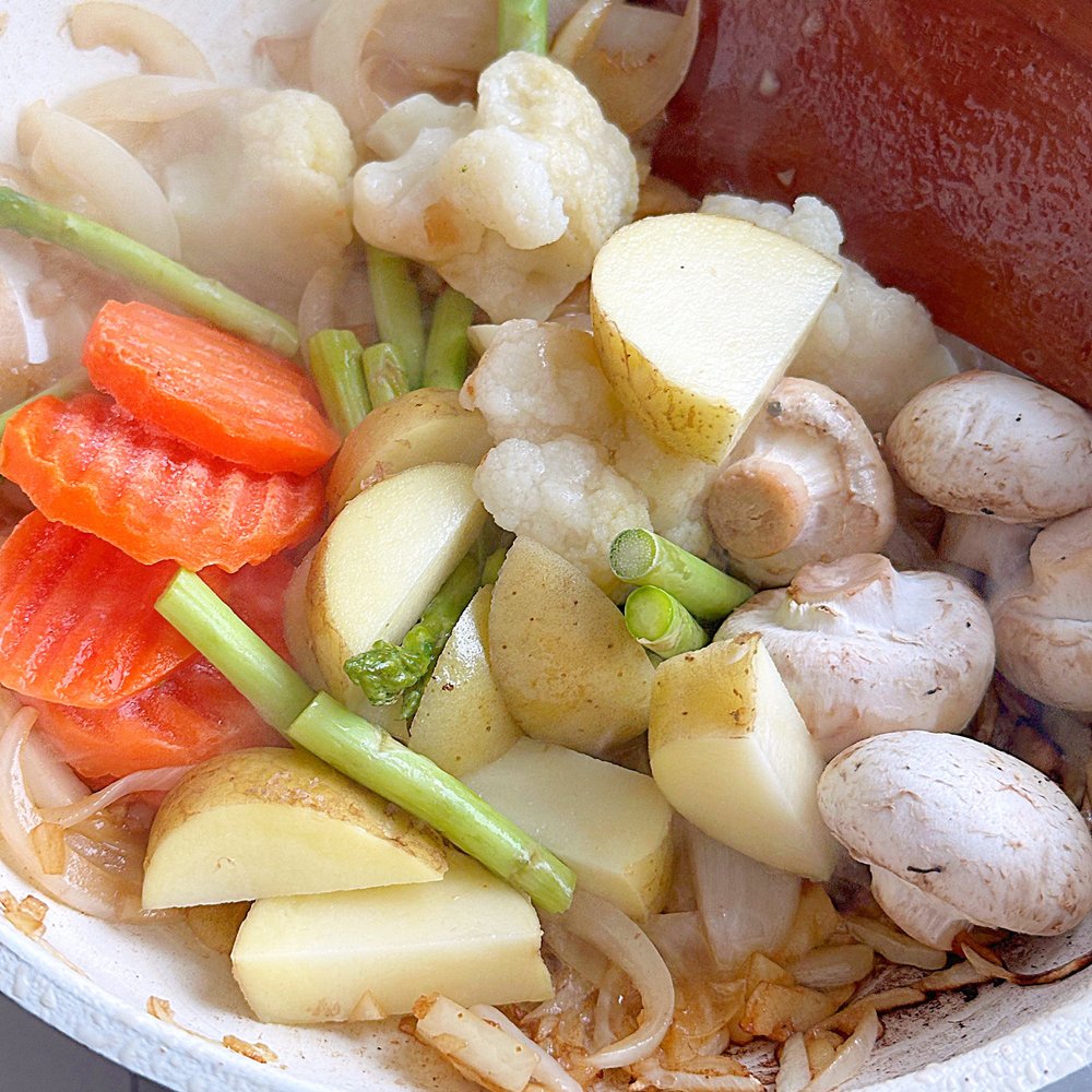 다짐육 동그랗게 만들어 미트볼 구워주고, (생략 가능) 다진 마늘과 양파를 볶아주다가, 자투리 채소들 넣고 (저는 감자, 양송이, 당근, 아스파라거스, 콜리플라워 넣었어요!) 채소들을 익혀주다가 토마토 홀 넣고, 으깨줍니다 (저는 남는 토마토 하나 있어서 같이 넣어줬어요 생략 가능)
