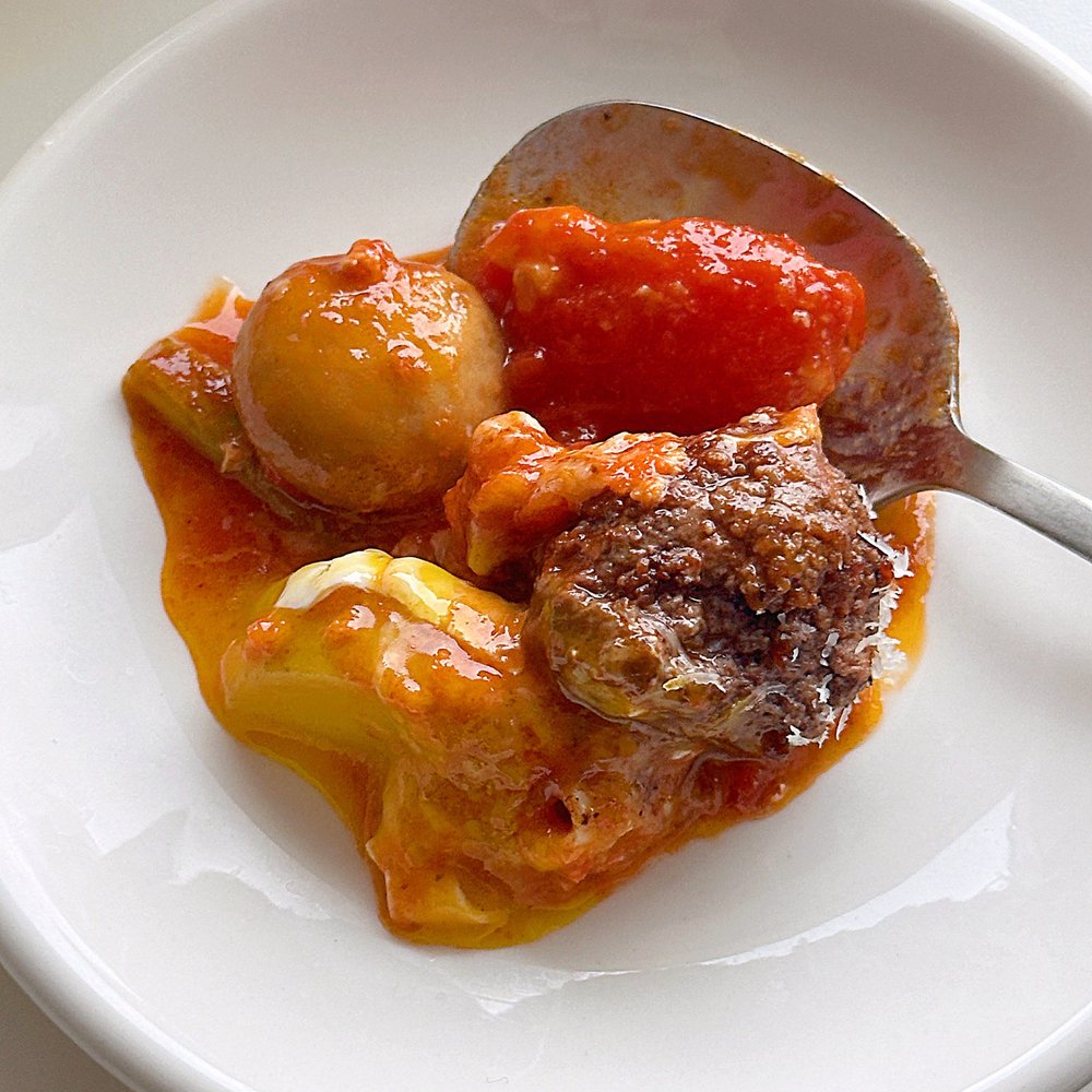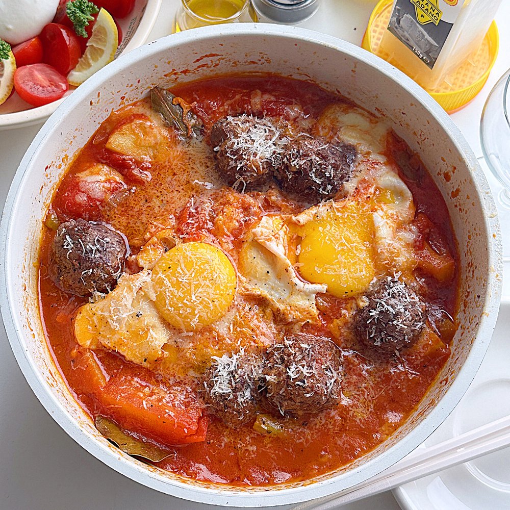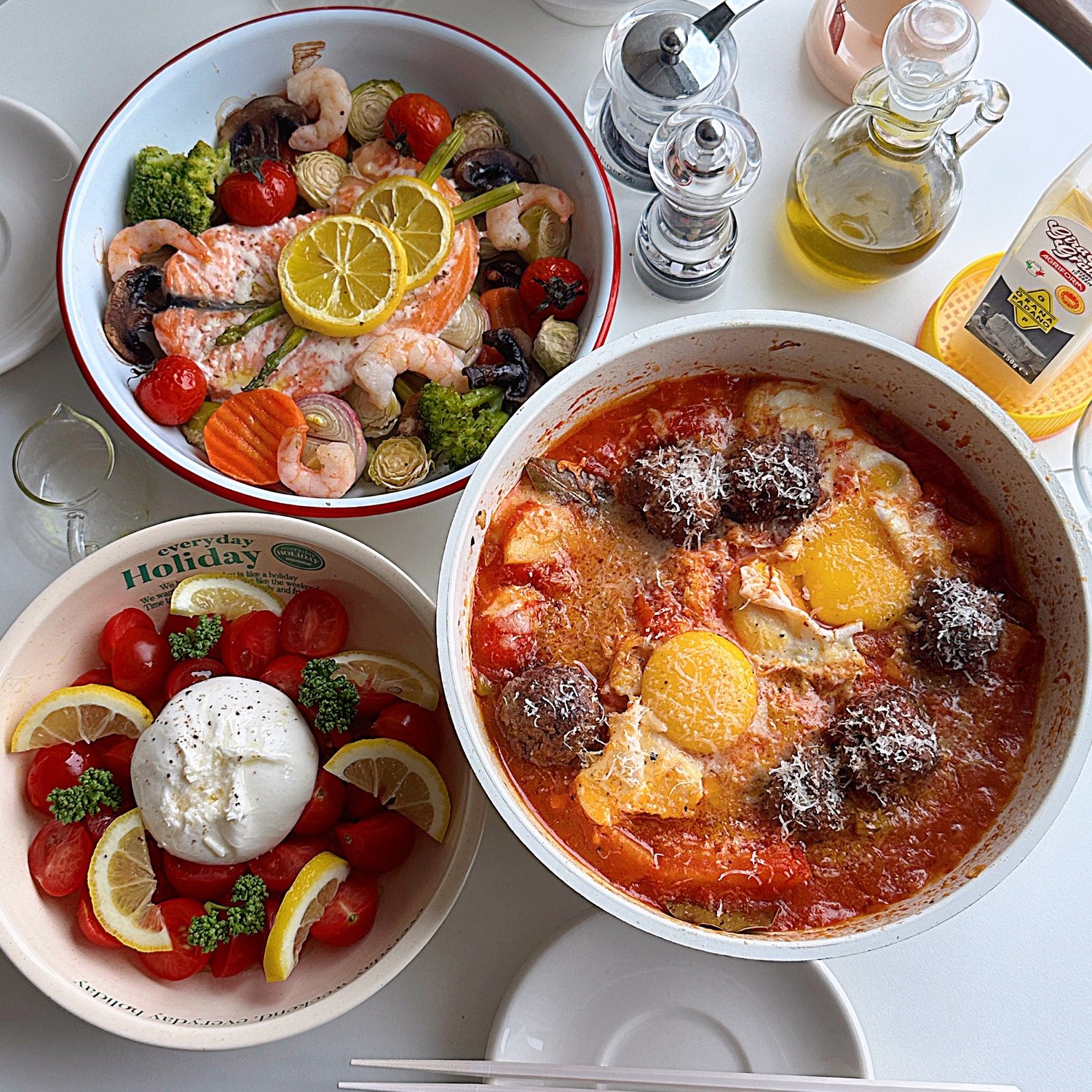 지옥(토마토소스)에 빠진 계란이라는 귀여운(?) 별명을 가진 메뉴인데, 토마토와 계란의 조합이 아주 기가 막혀요. 살짝 구운 바게트를 찍어 먹으면 예술이라 찍먹 꼭 추천드려요! 레시피도 세상 간단합니다.