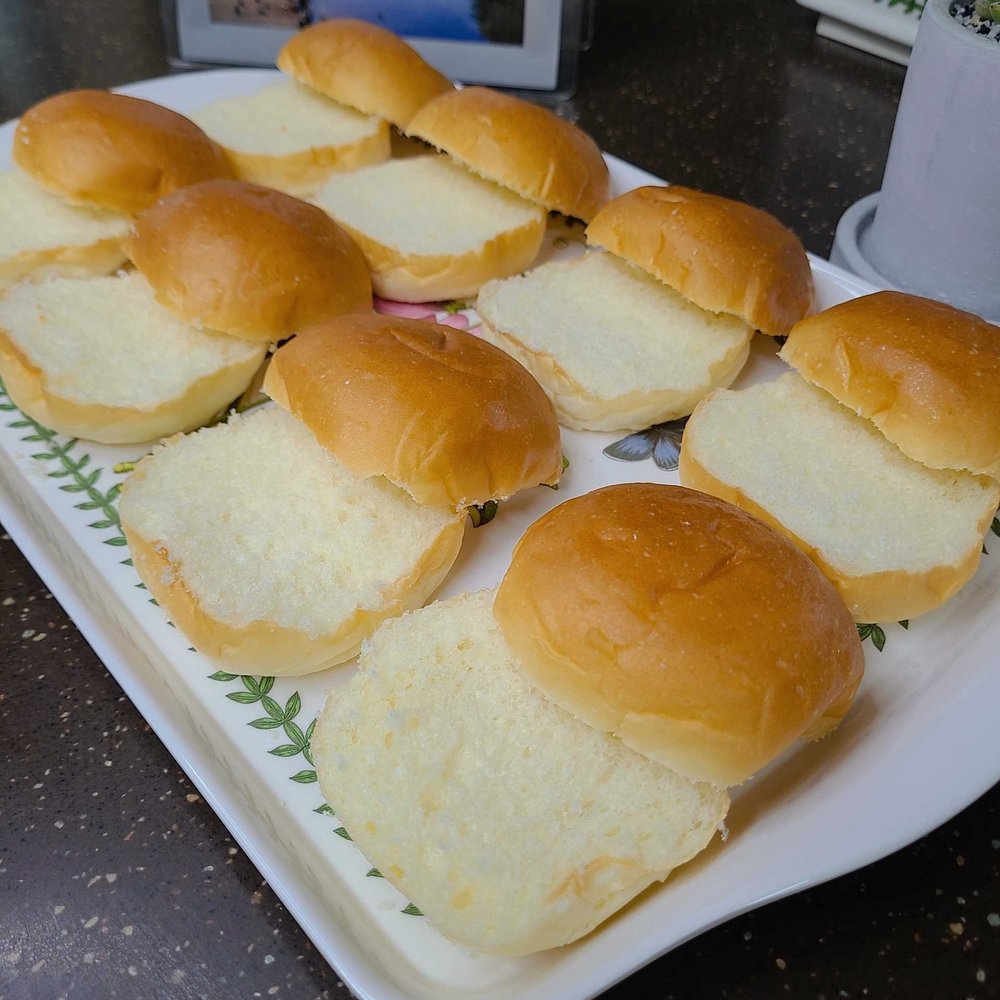 슬라이더는 보통 디너롤로 만들지만, 그냥 한국의 모닝빵하고 똑같아요. MY FIRST 제품이 저렴하면서도 부드럽고 맛있어요.