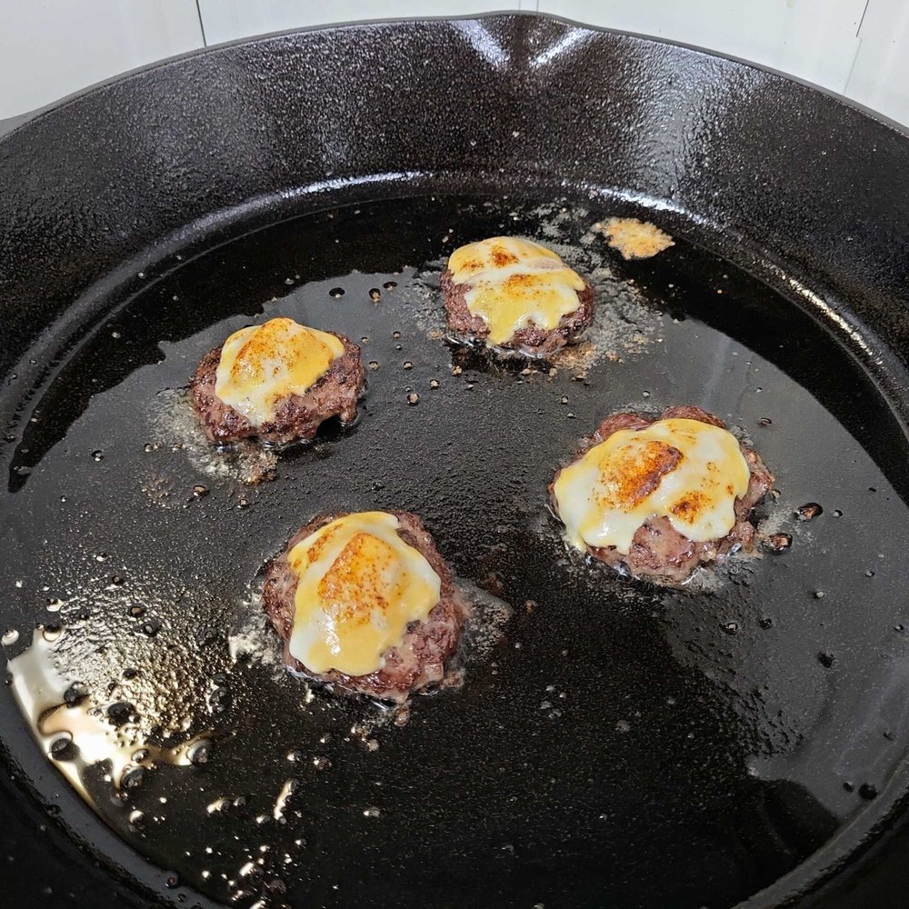 한 면을 약 40초~1분 이내로 익힌 다음 뒤집고 치즈를 올려주세요. 뚜껑을 덮고 1분 정도 더 익히면 됩니다. 뚜껑을 덮어도 치즈가 충분히 녹지 않았다면 토치를 써서 살짝 그을려도 좋아요.