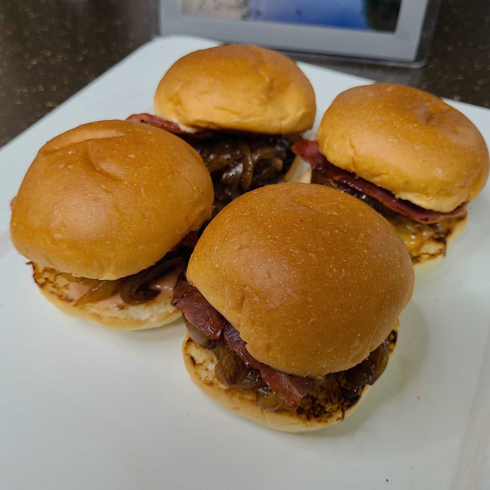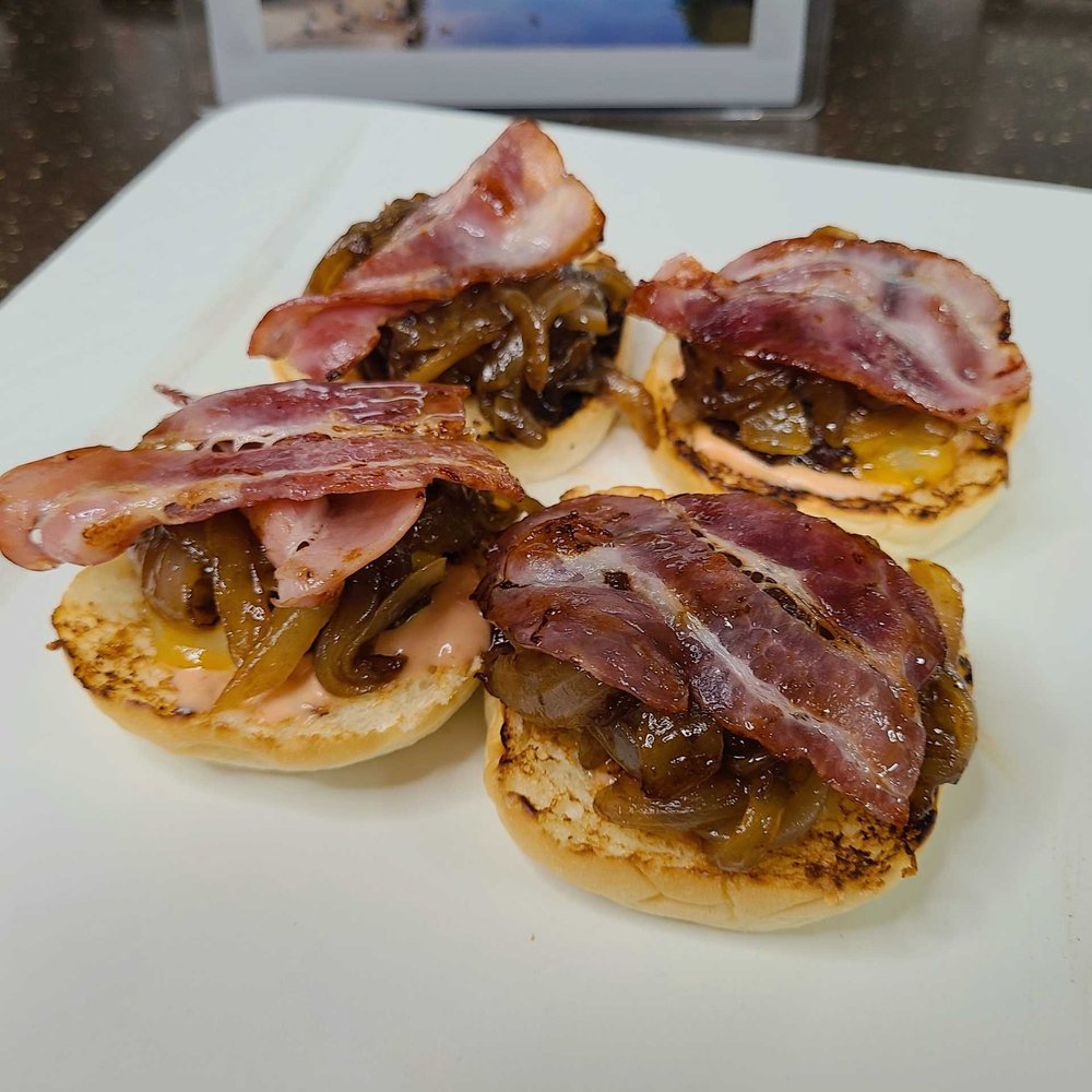 이제 빵에 버거 소스를 바르고 고기랑 양파, 베이컨을 차례대로 올리면 완성입니다.