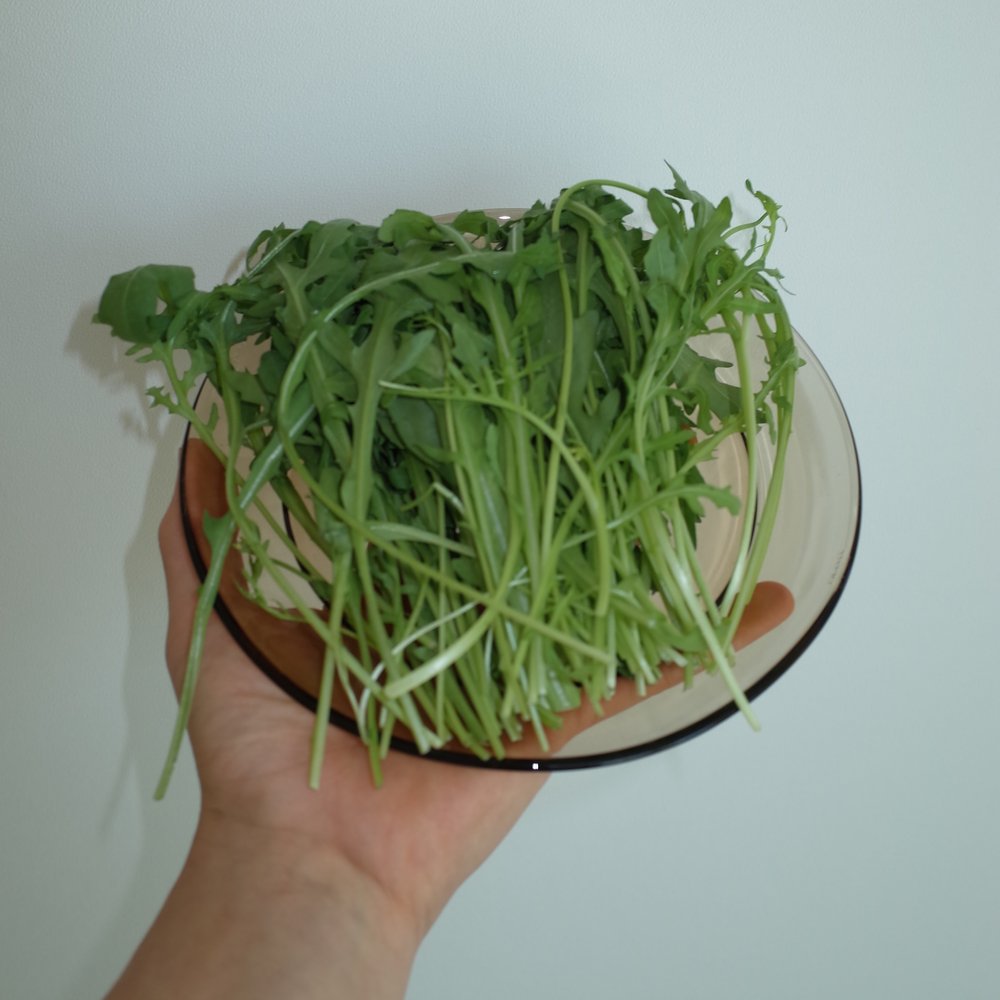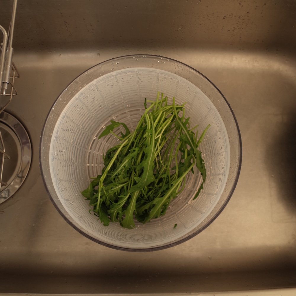 1. 제일 먼저 해야 할 것은 루꼴라를 씻어 물기를 제거하는 일이에요. 야채 탈수기를 이용해도 좋고, 채반에 받쳐 키친 타월로 물기를 닦아내도 좋아요. 파스타 면과 닿기 전, 루꼴라에 물기가 아예 없어야 해요.