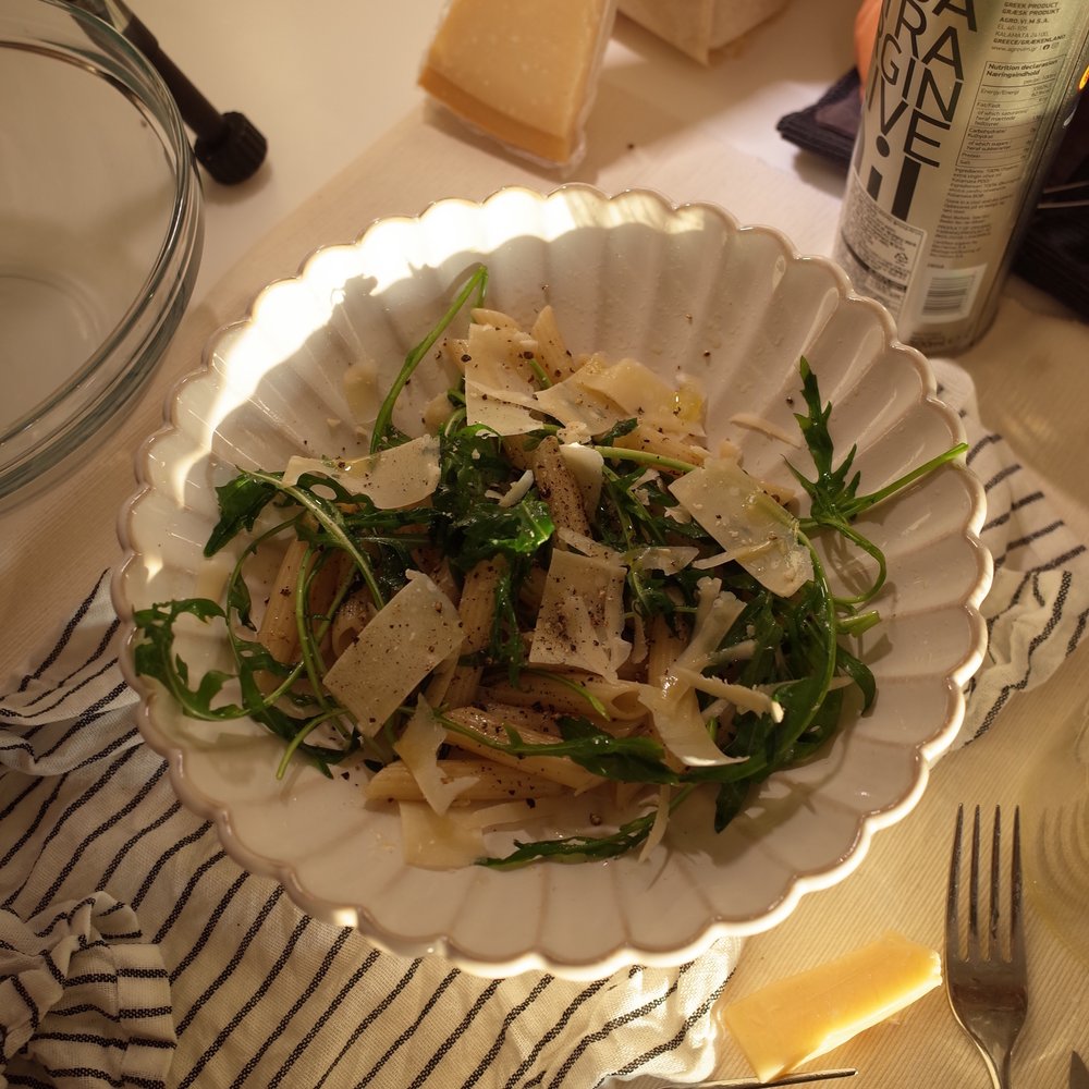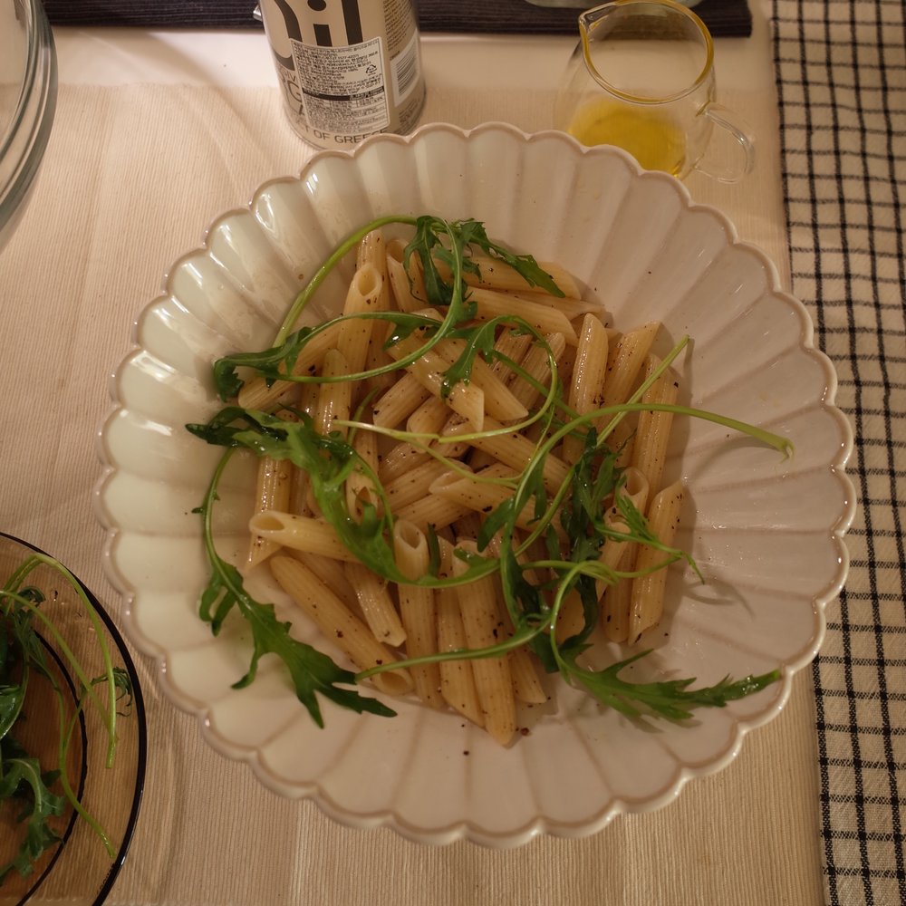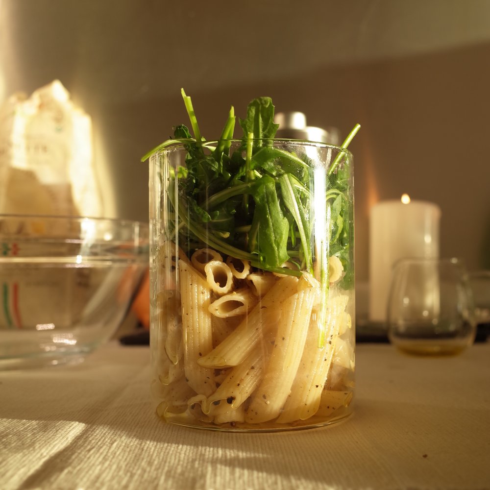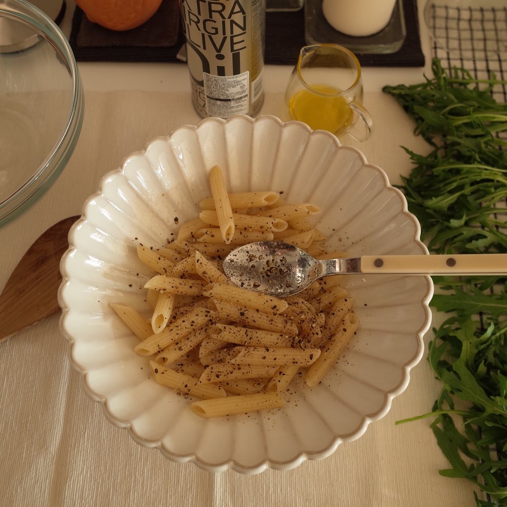 3. 세 번째로 해야 할 일은 조립! 체온보다 낮게 식은 파스타를 그릇에 담고, 루꼴라를 취향껏 올립니다. 그리고 올리브 오일 듬뿍, 흑후추를 과감히 뿌려 뒤적거리다 먹으면 됩니다!