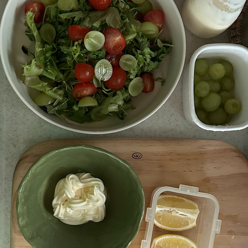 1) 샐러드 믹스를 담고 포도와 방울토마토는 반으로 커팅해 올려줍니다.