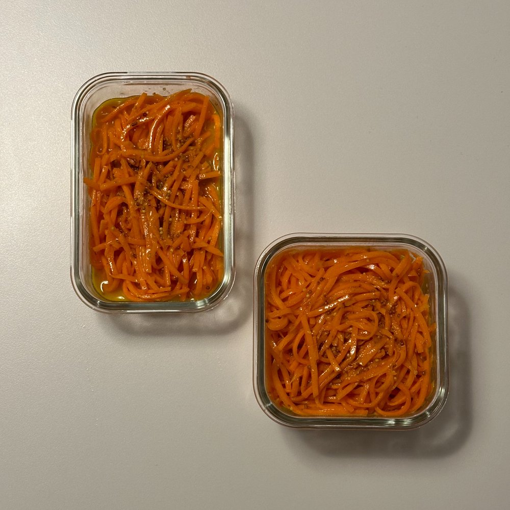 2) 숨이 죽은 당근에 화이트 발사믹 3T, 디종 머스터드 1t, 홀그레인 머스터드 1t, 레몬즙 1T, 올리브유를 넣고 섞어주세요. 완성된 당근 라페는 1~2시간 냉장고에 숙성합니다.