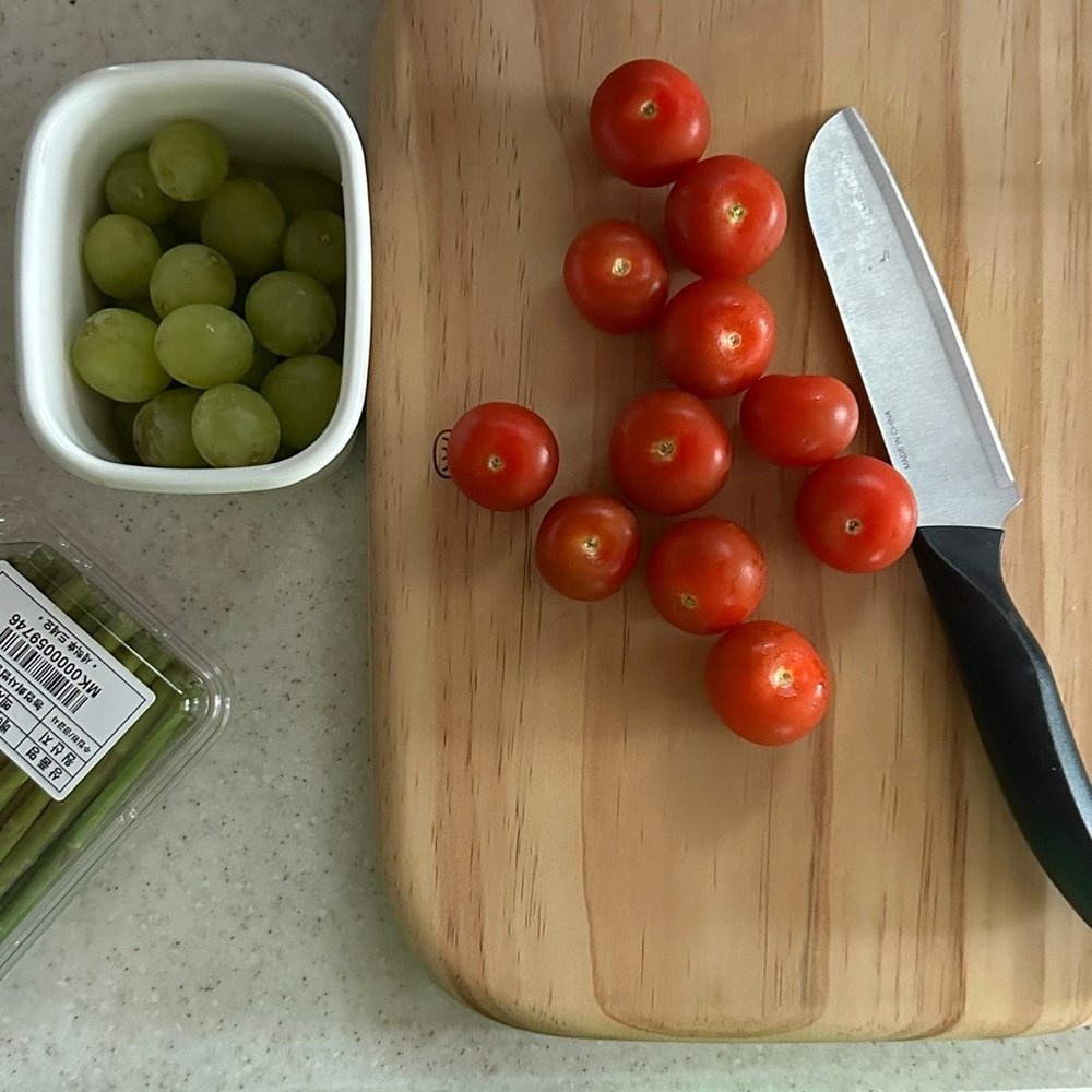 2) 면을 삶는 동안 방울토마토는 2등분으로 자르고, 브리치즈는 손가락 한 마디 정도 크기로 썰어주세요.