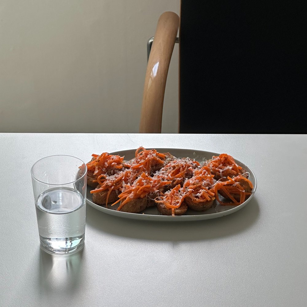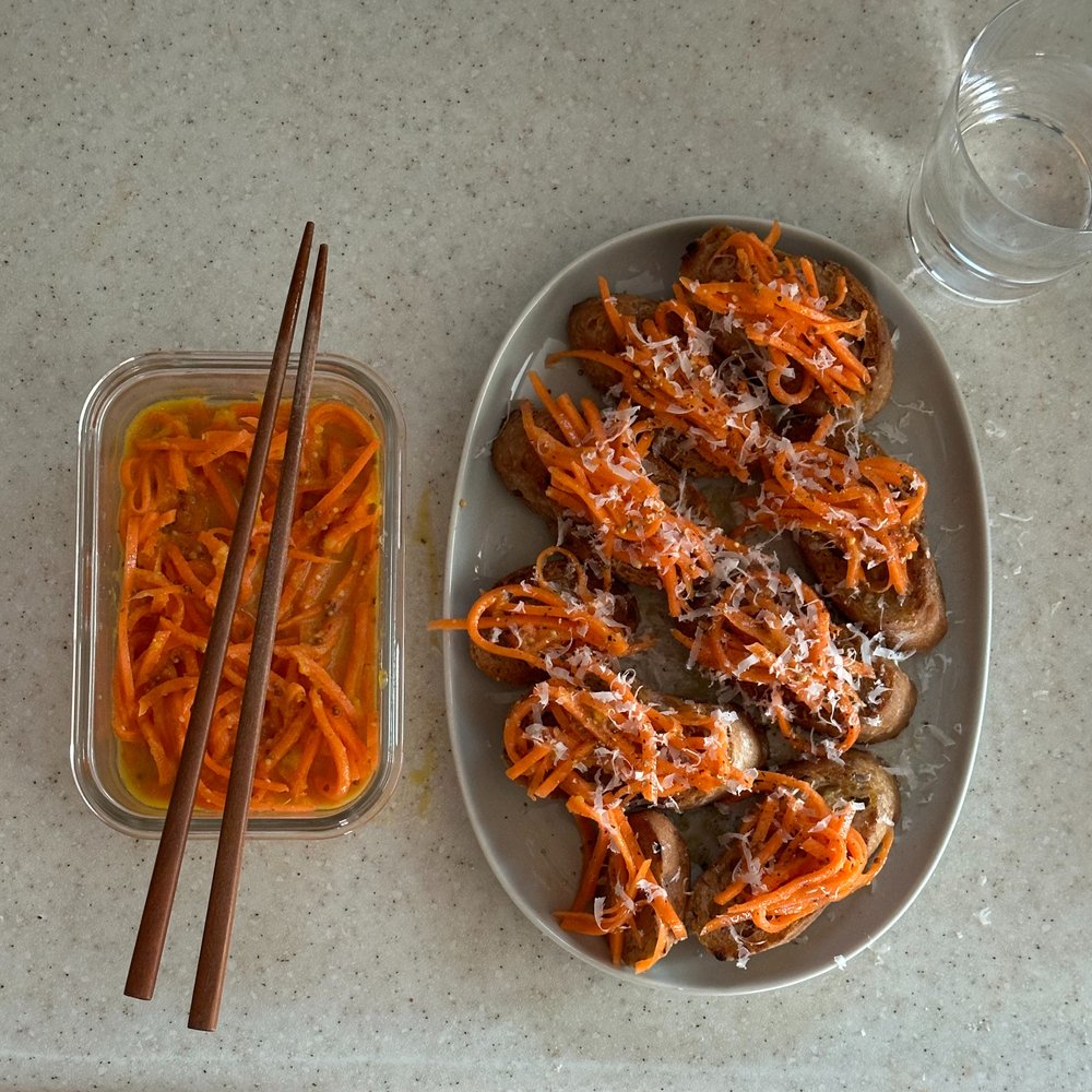 4) 당근 라페를 구운 빵 위에 올리고 올리브유와 후추, 치즈를 갈아 뿌려주면 완성입니다.