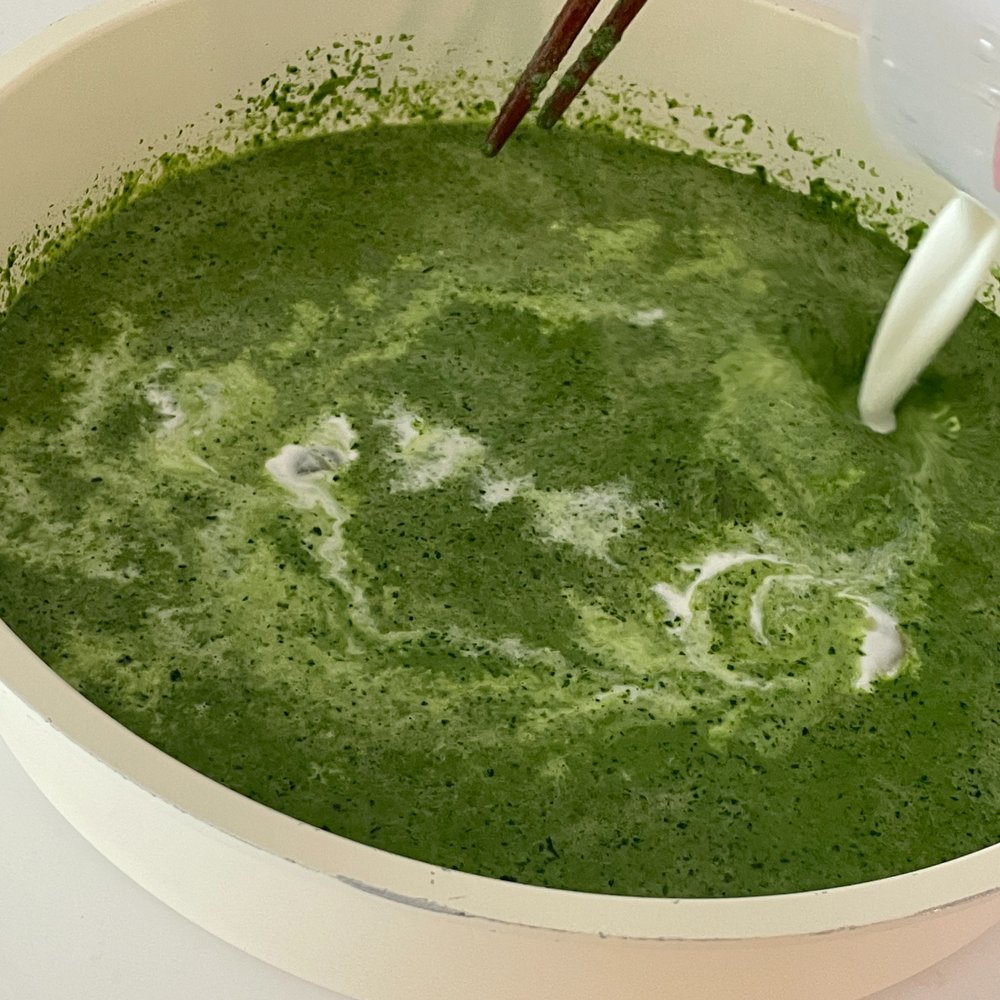 2. 시금치 120g 우유 200ml 를 믹서기에 넣고 곱게 간다.