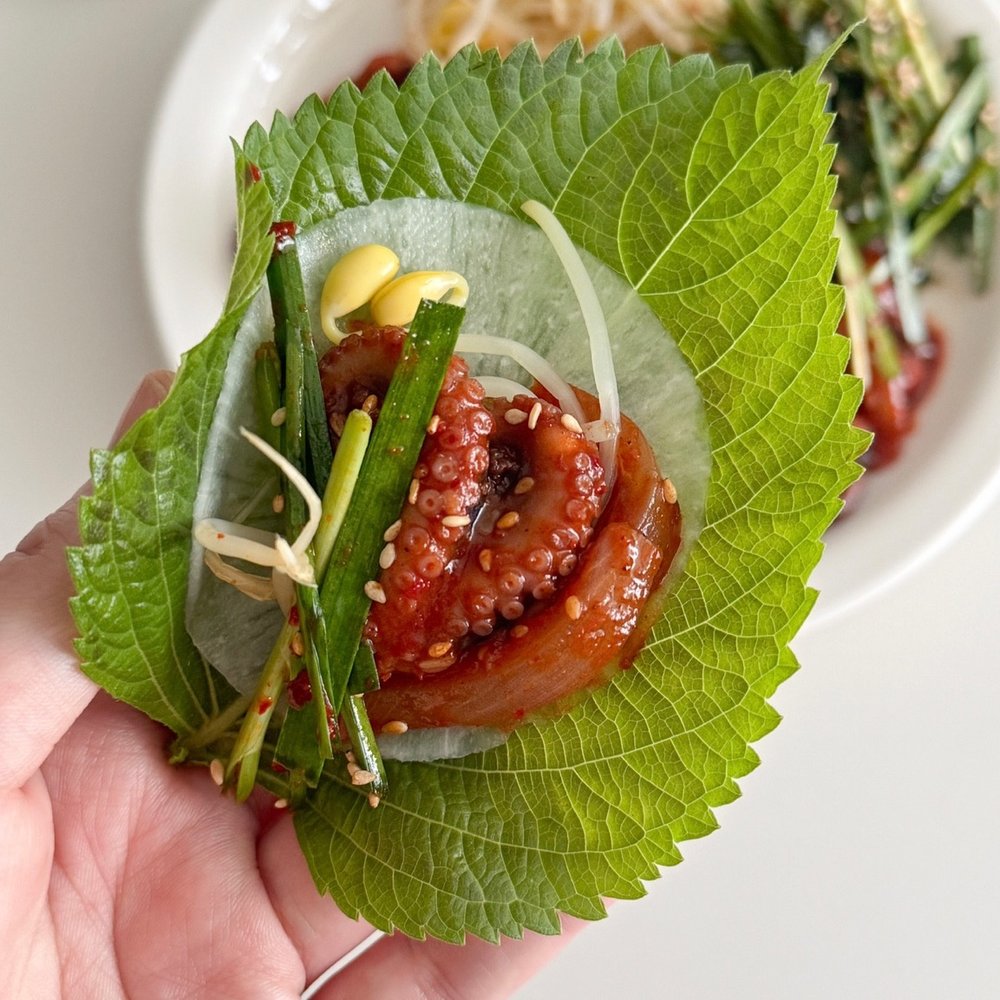 날치알, 깻잎, 쌈무를 곁들여 알쌈을 만들어 드셔보세요. 향긋한 깻잎과 톡톡 터지는 날치알이 별미랍니다.