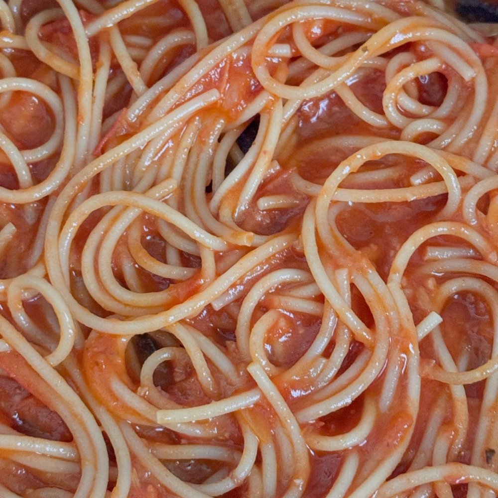 올리브오일에 마늘, 토마토, 페페론치노 약불에 볶아 만든 무수분 토마토소스는 심플하지만 감칠맛이 진짜 좋아요!
