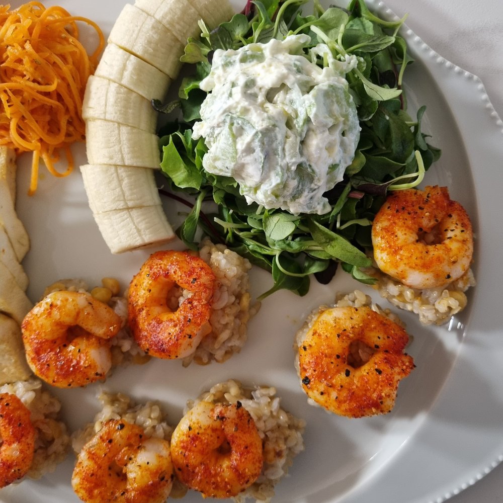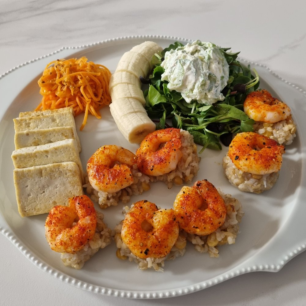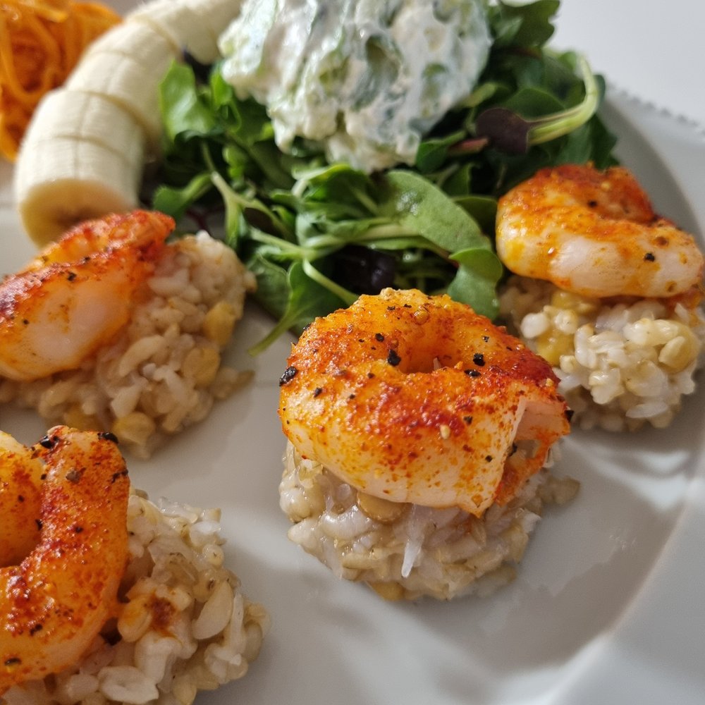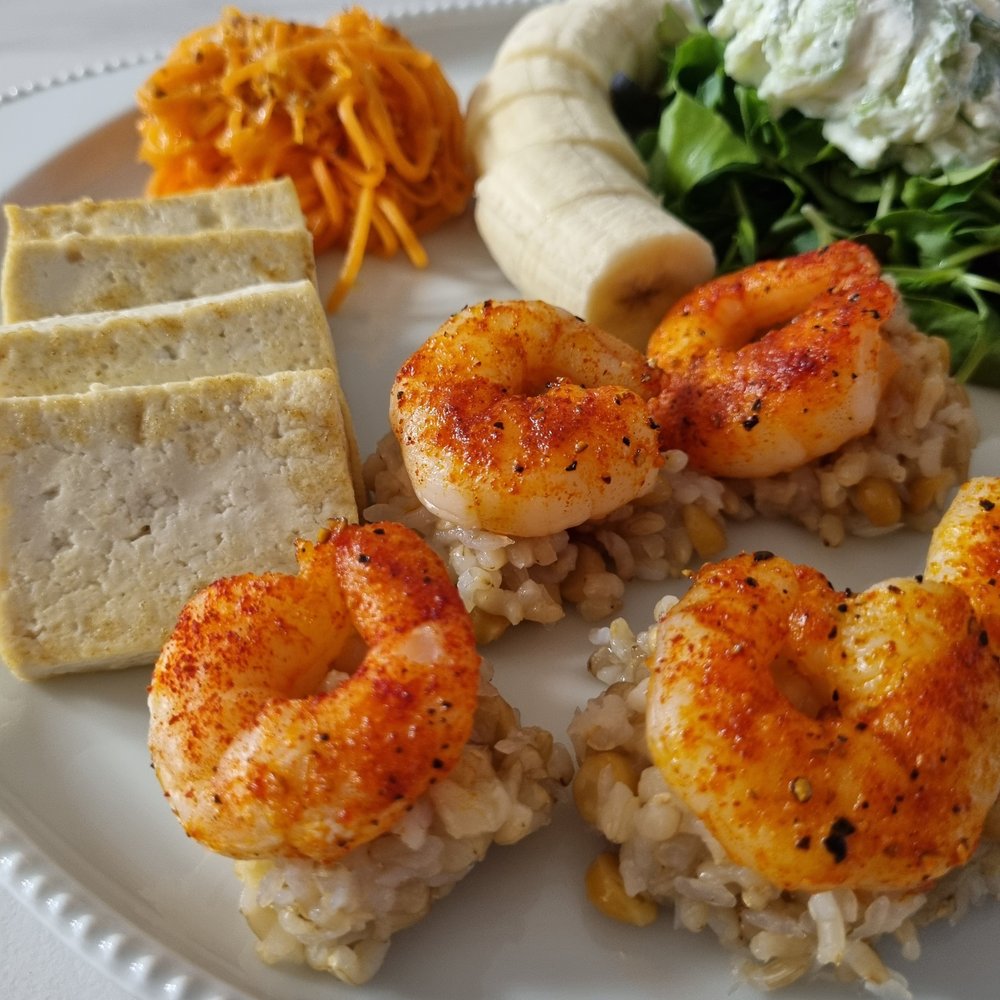 잘 구워진 새우는 병아리콩 곤약밥 위에 한 마리씩 올려서 먹기 좋게~