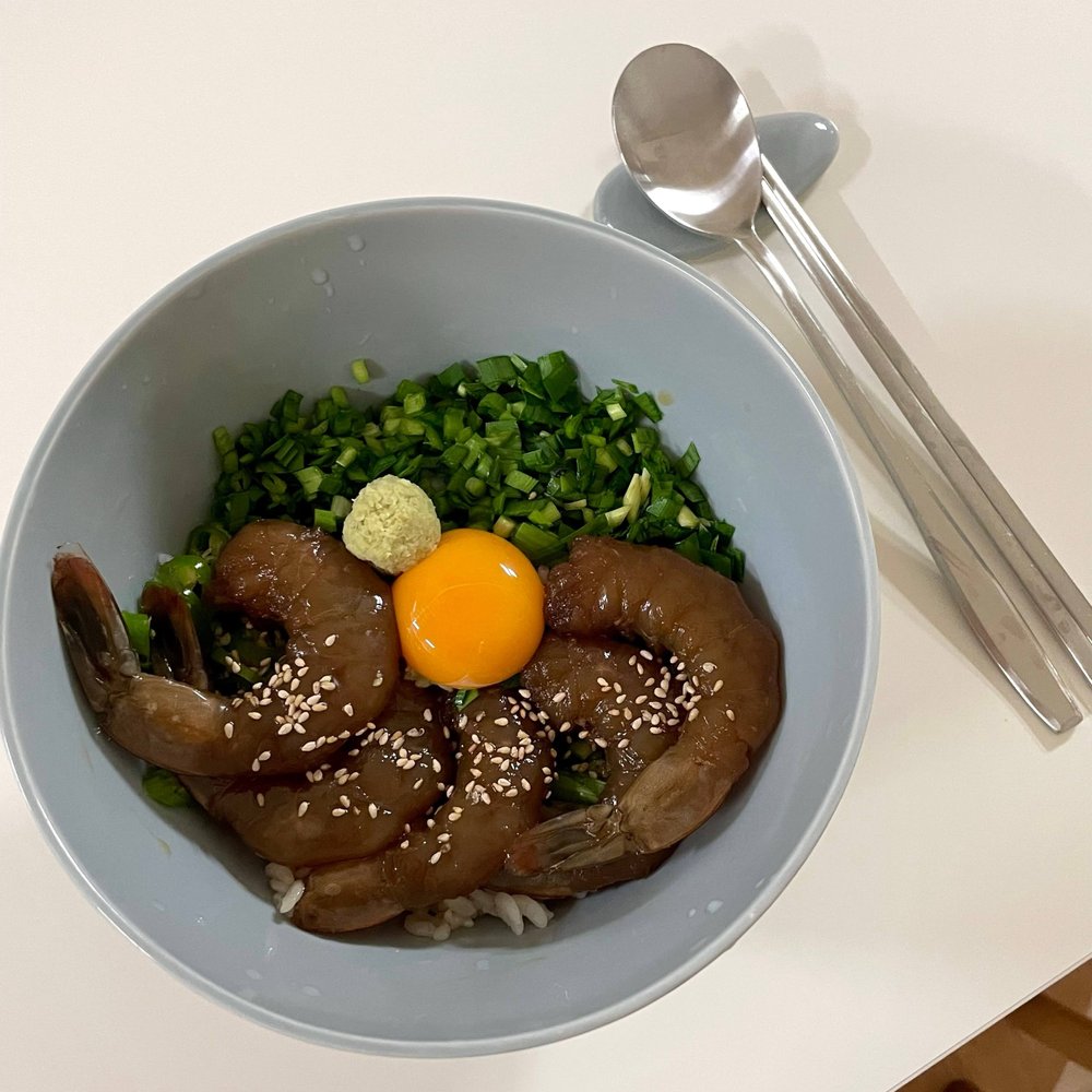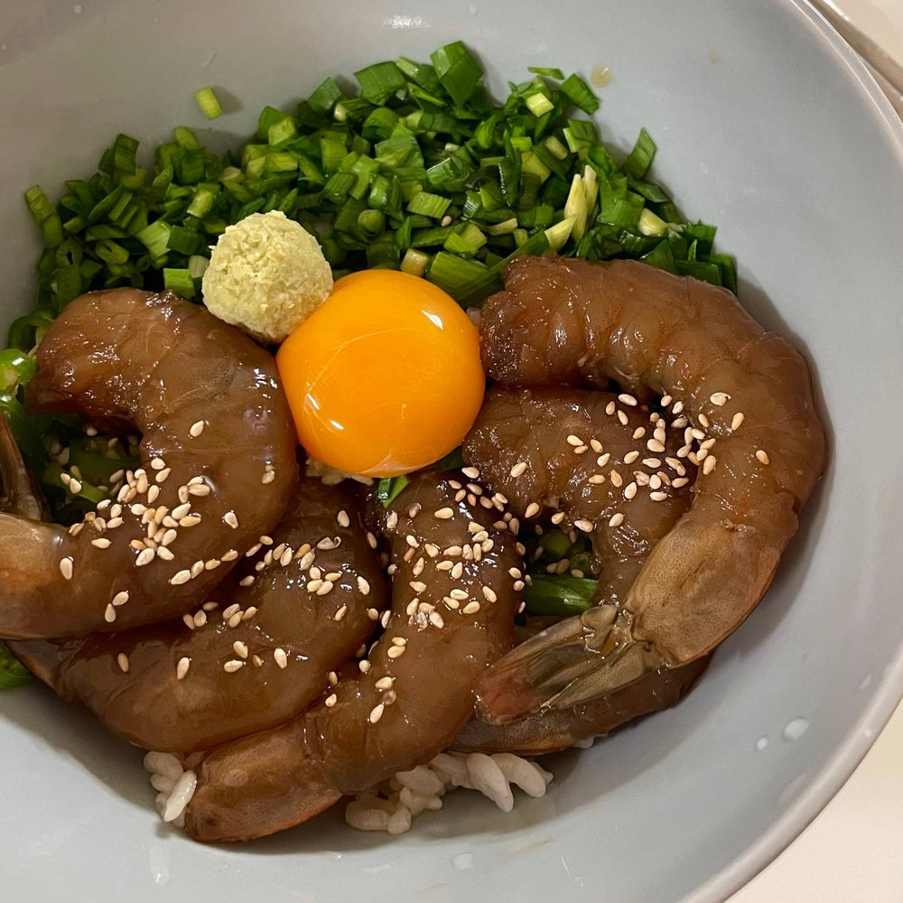 깐 새우장, 흰쌀밥, 부추, 참기름, 깨, 노른자, 와사비