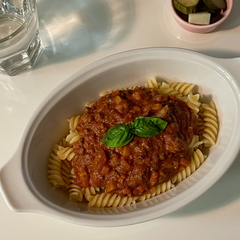 푸실리면, 올리브유 1T, 버터 1조각, 작은 감자 1개, 양파 1/2개, 당근 1/4개, 다진 쇠고기 200g, 토마토퓌레 500g, 물 2컵, 치킨 스톡 1조각, 채소 육수 가루 1T, 바질 한 줌, 월계수 잎 2장, 소금, 후추, 파마산 치즈