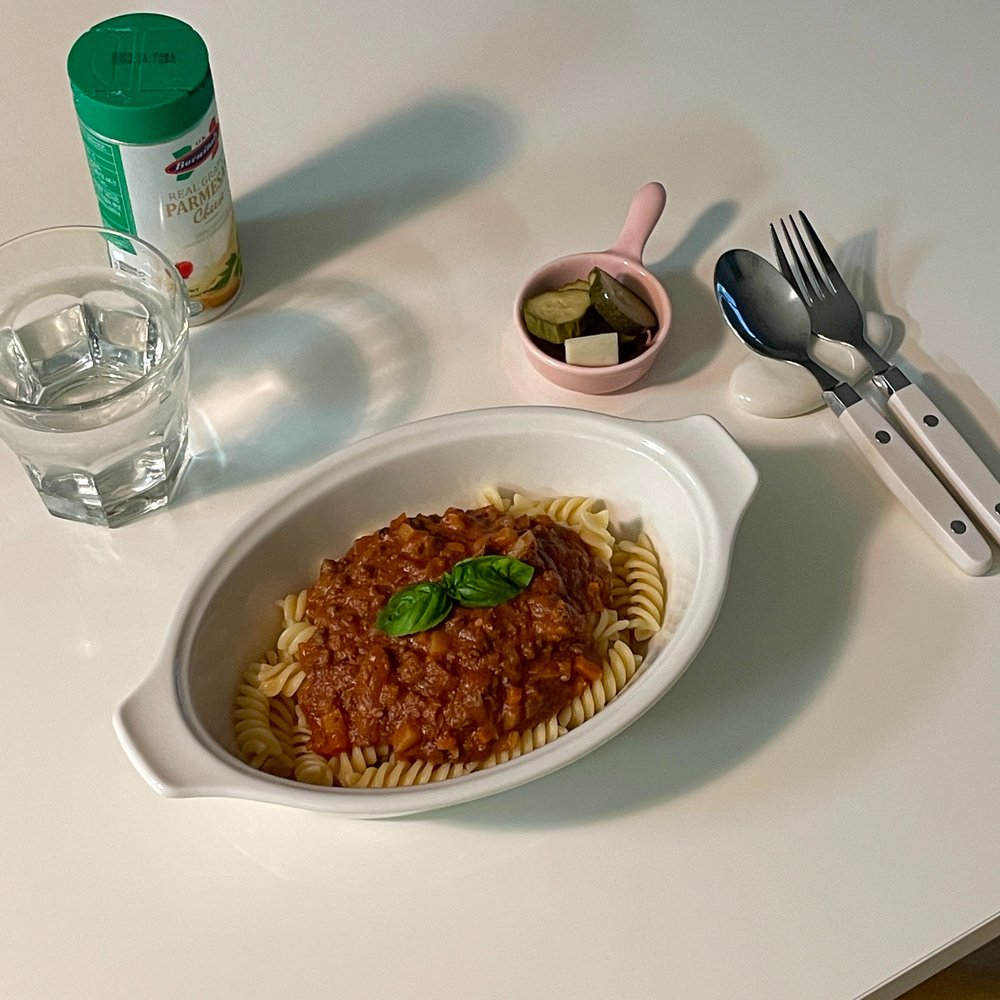 7. 푸실리-라구 소스-파마산 치즈 순으로 담아 먹어주세요.