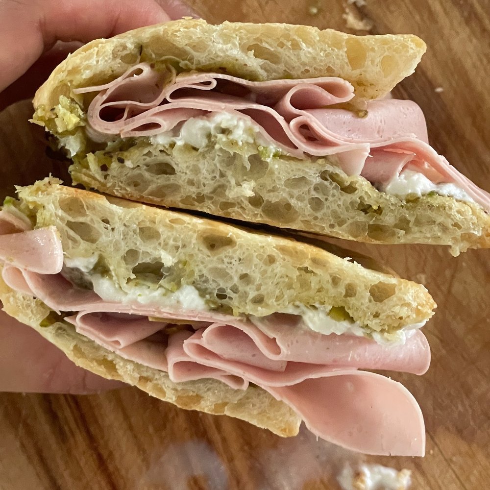 얇은 포카치아나 하드빵에, 블렌더에 곱게 갈아 스프레드 피스타치오를 듬뿍 발라주고, '소금집 모르타텔라'를 겹겹이 쌓아주고, 스트라치아텔라에 크림치즈와 우유를 넣어 더욱 진한 유크림 맛을 내주어 스무스한 질감을 만들어 샌드해 줍니다.