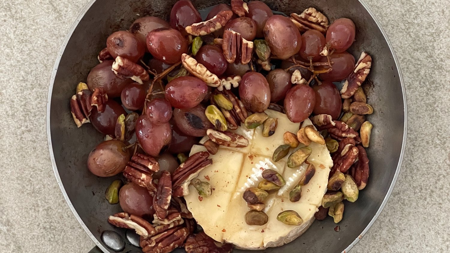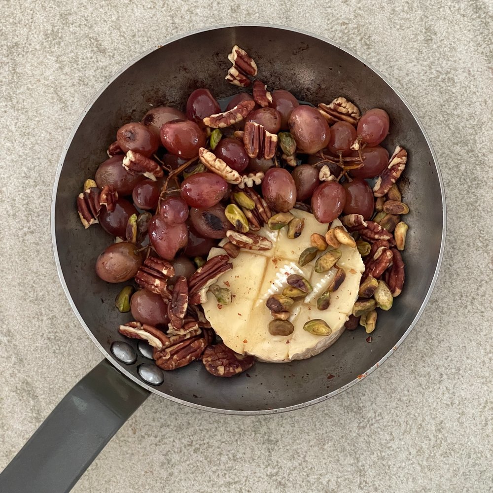 치즈의 안쪽까지 말랑해지게 익을 때쯤 포도를 넣어 구움색이 날 정도로만 익혀줍니다. 너무 많이 익히면 수분이 빠져나와 물렁물렁한 식감이 되니 주의해 주세요. 살짝 아삭한 식감을 내주세요!