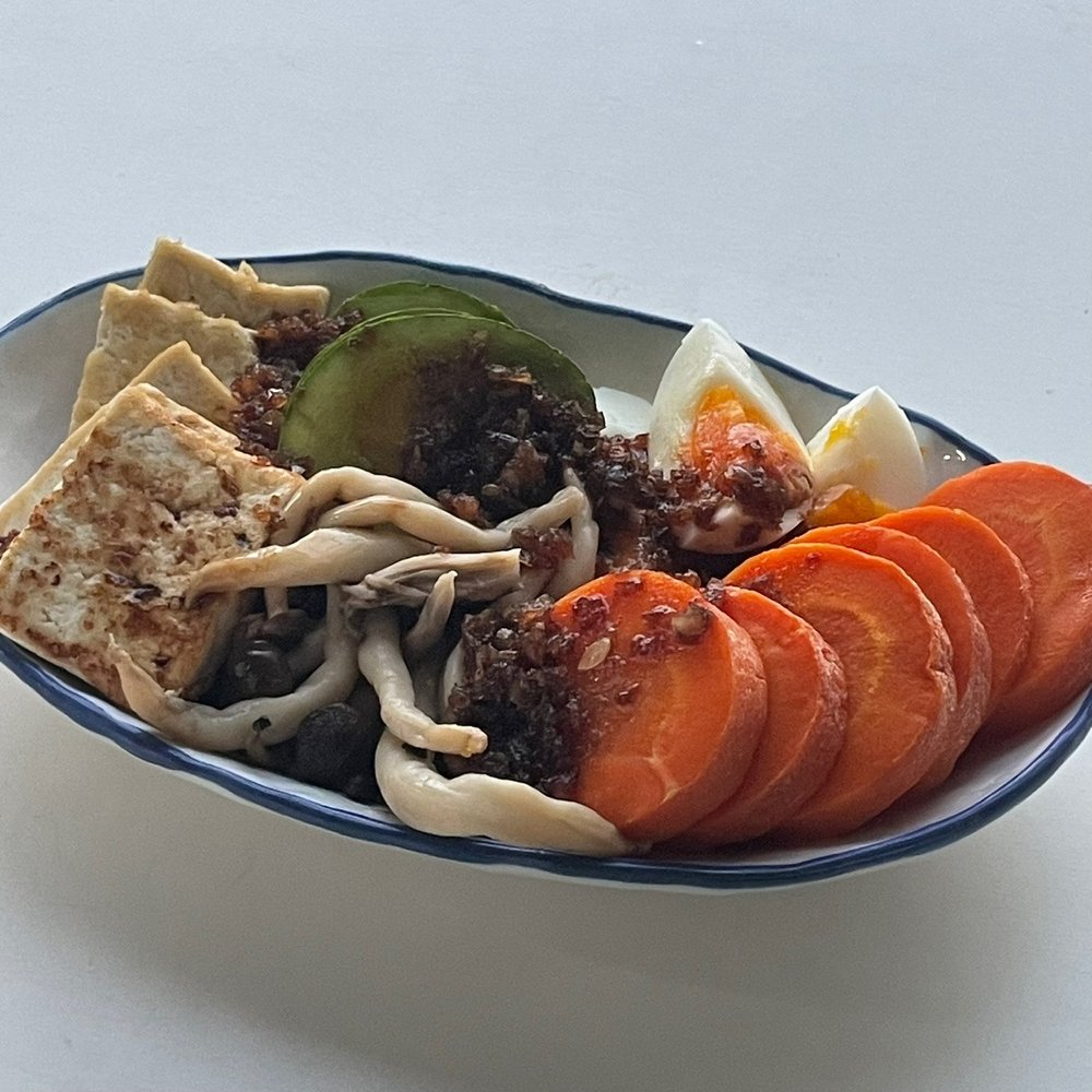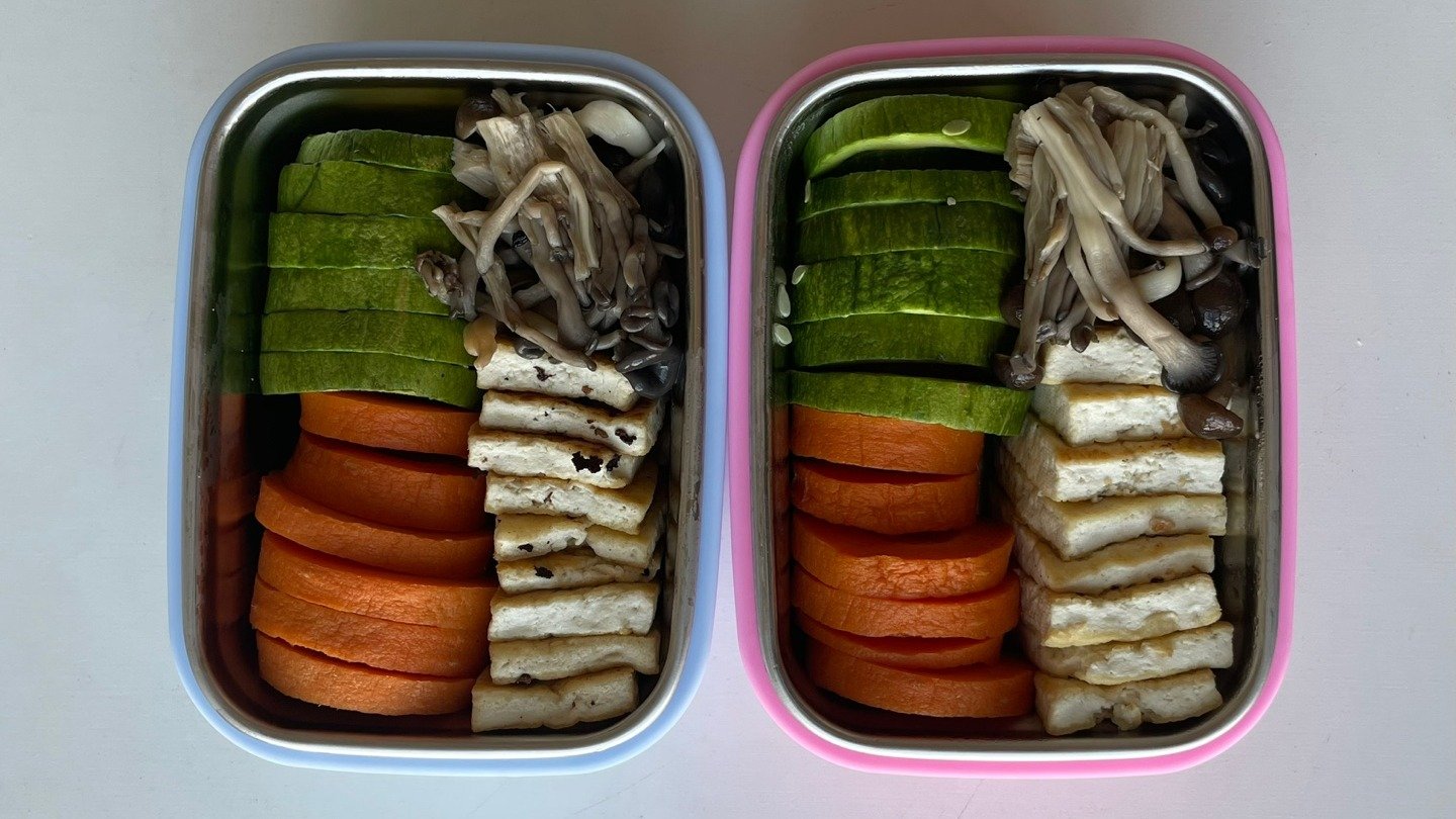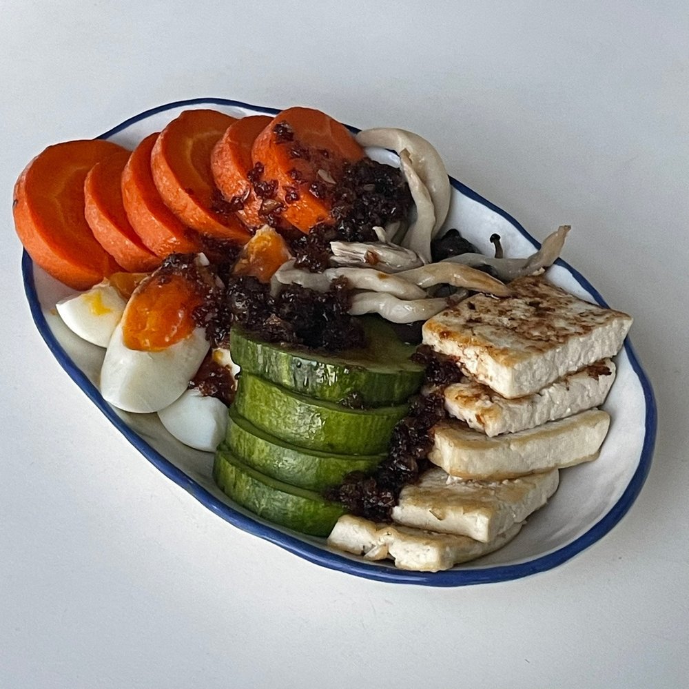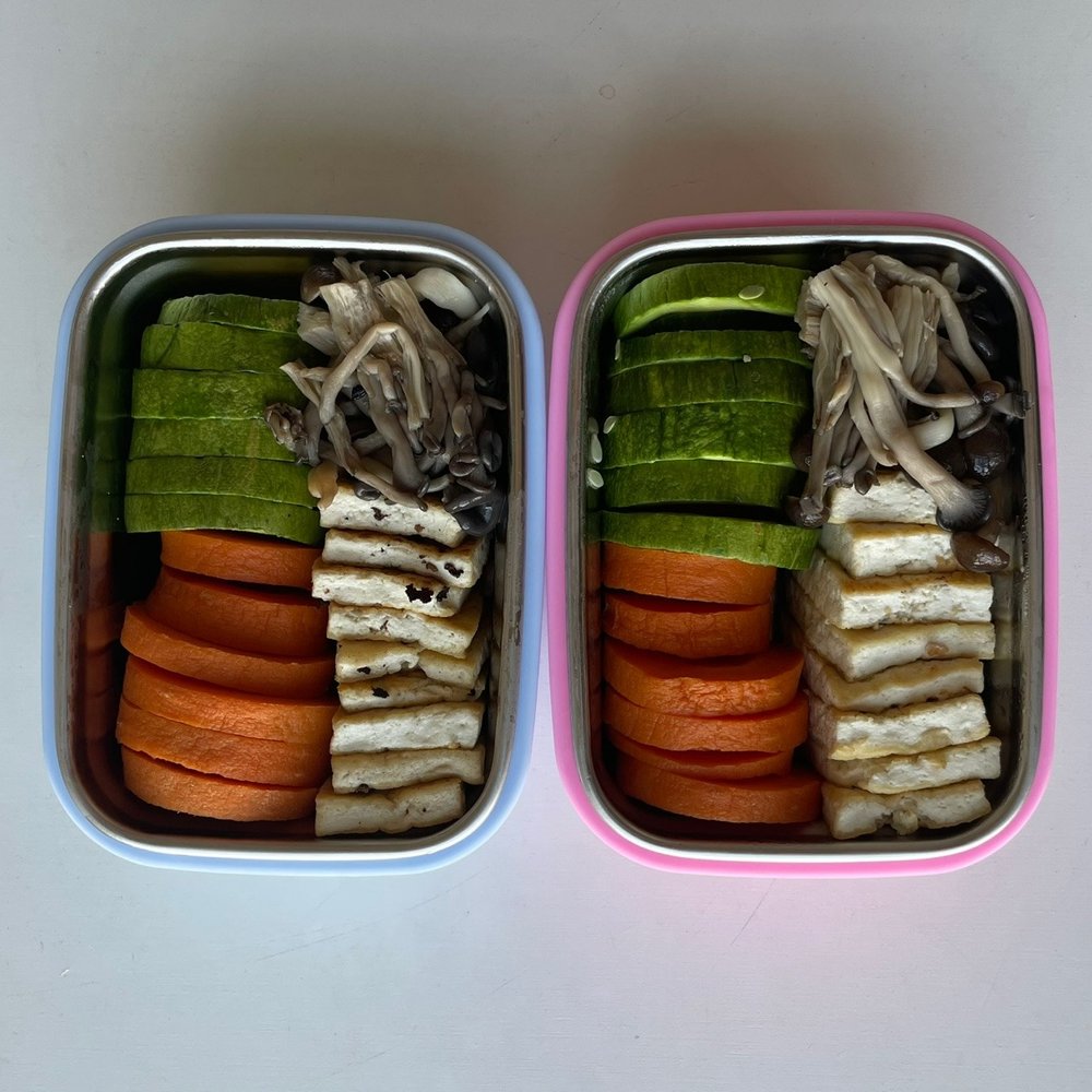 저는 야채찜에 부족한 단백질을 채워주려 두부구이와 반숙란도 곁들였어요. 두부구이도 야채 찌는 날 같이 구워서 소분해주면 좋겠죠?