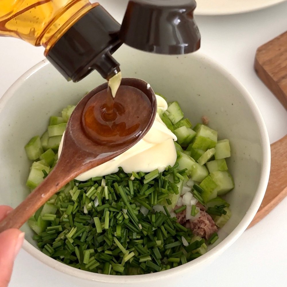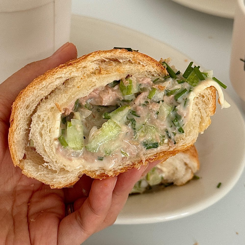 소금빵 2개, 슬라이스 치즈 2장, 기름 뺀 참치 1캔, 다진 양파 1/2개, 깍둑썬 오이 1/2개, 다진 부추 한 줌, 마요네즈 3스푼, 알룰로스 2스푼, 후추 1꼬집