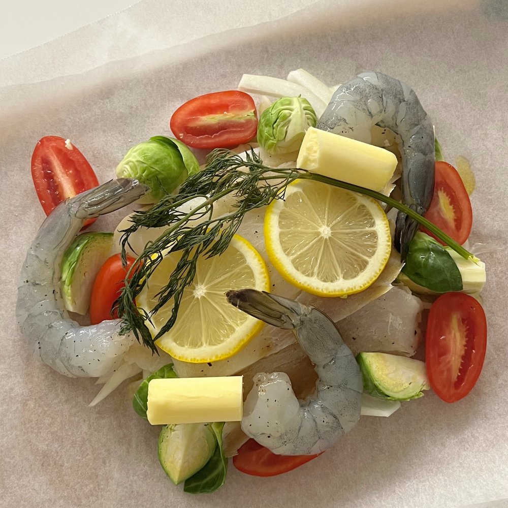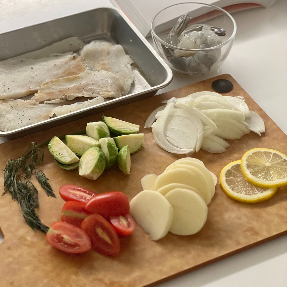 대구 살 150g, 버터 15g, 맛술 1T, 새우 4마리, 양파 1/4개, 감자 1/2개, 방울토마토 3개, 미니 양배추 3개, 레몬 슬라이스 2개, 딜 1줄기, 올리브오일 적당량, 소금, 후추