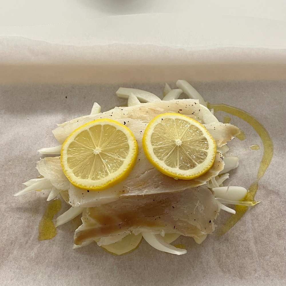 4. 종이 호일에 올리브오일을 두르고 감자를 깔고 소금과 후추를 뿌린 후 양파, 대구 살, 레몬 슬라이스를 차례로 올려주세요.