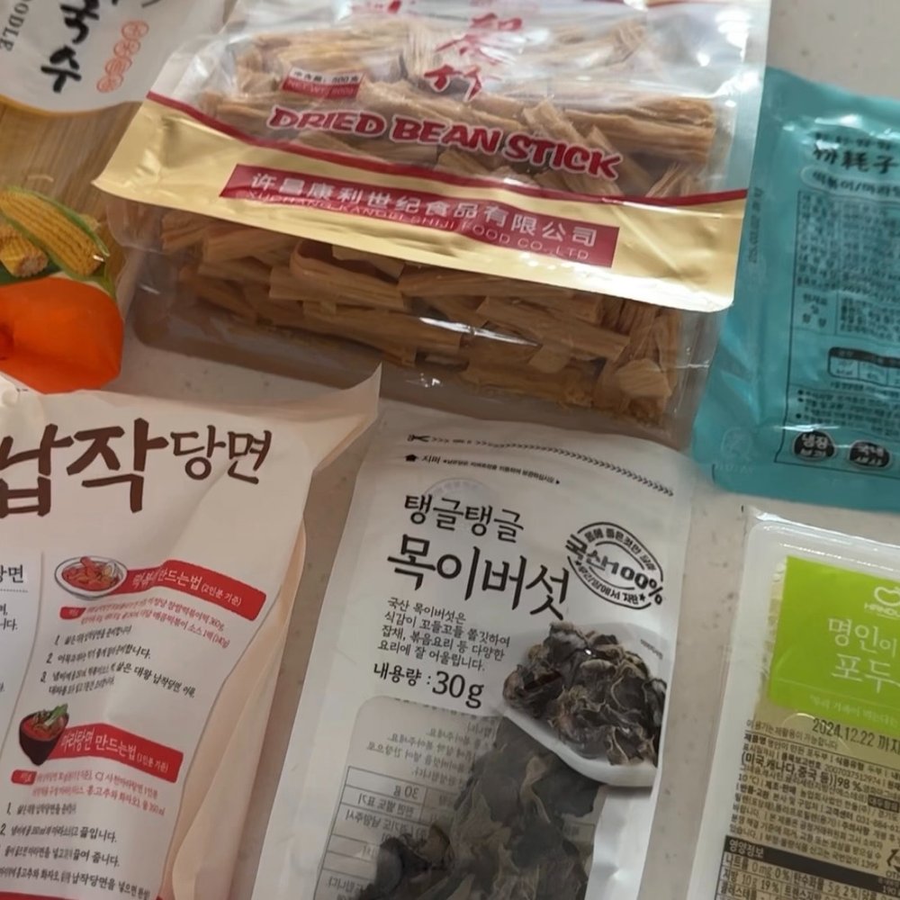 저는 이번에 컬리 제품으로는 건 푸주, 옥수수 국수, 납작 분모자, 건목이버섯, 샤브샤브 소고기를 준비했는데요.