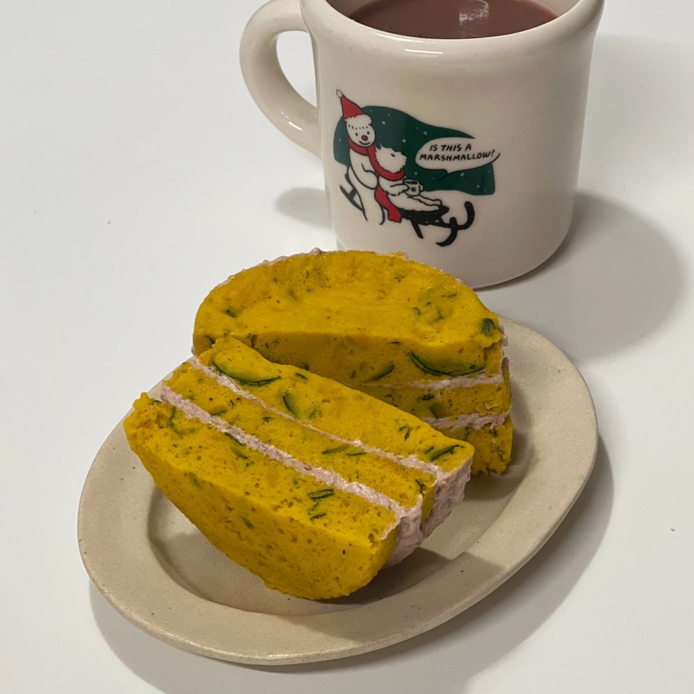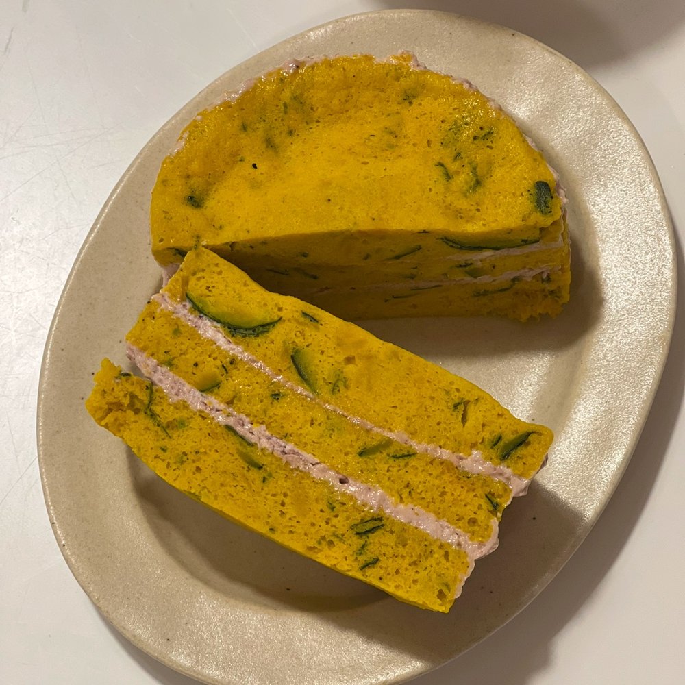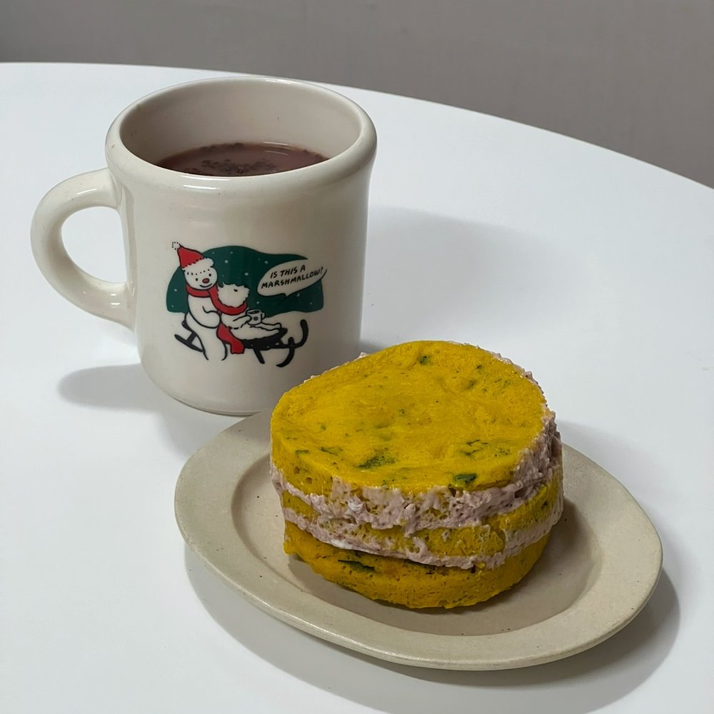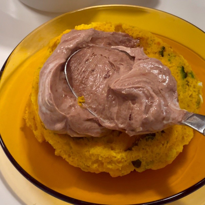 모든 재료를 섞어 전자레인지에 돌리면 단호박 시트 완성이에요! 계란이 들어가니, 스테비아나 알룰로스로 추가의 단맛을 더해주어야 더 케이크 시트 같은 느낌으로 완성돼요!