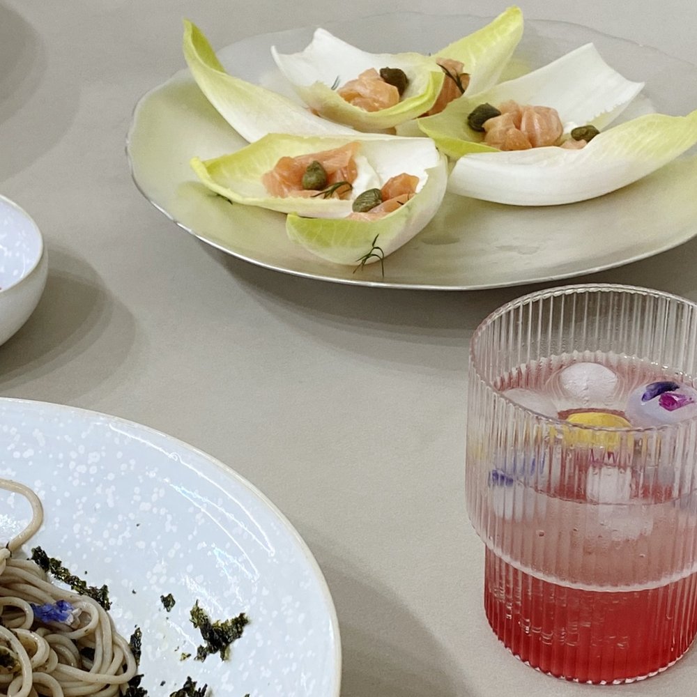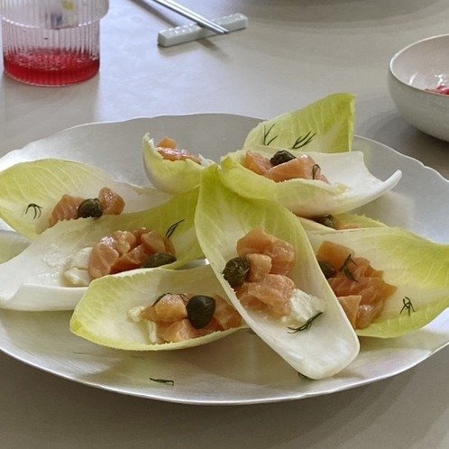 쯔유에 버무린 토핑 연어로 엔다이브 샐러드도 만들기 좋아요. 엔다이브 위에 연어, 케이퍼, 양파, 리코타치즈를 올리고 올리브오일, 비네거로 드레싱 해주면 정말 근사한 샐러드가 완성됩니다.