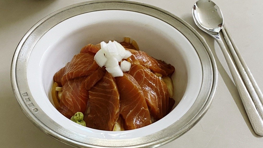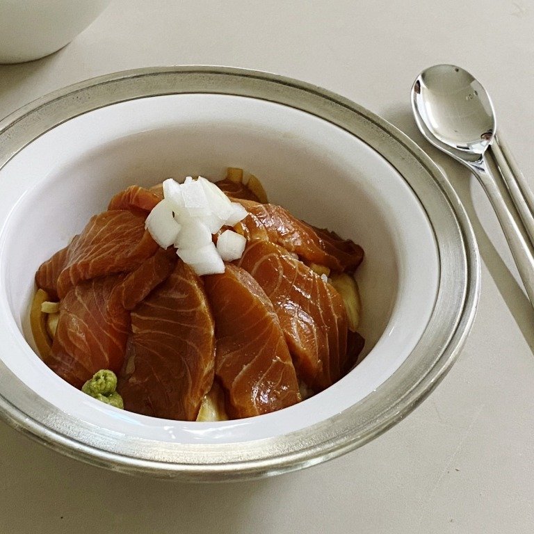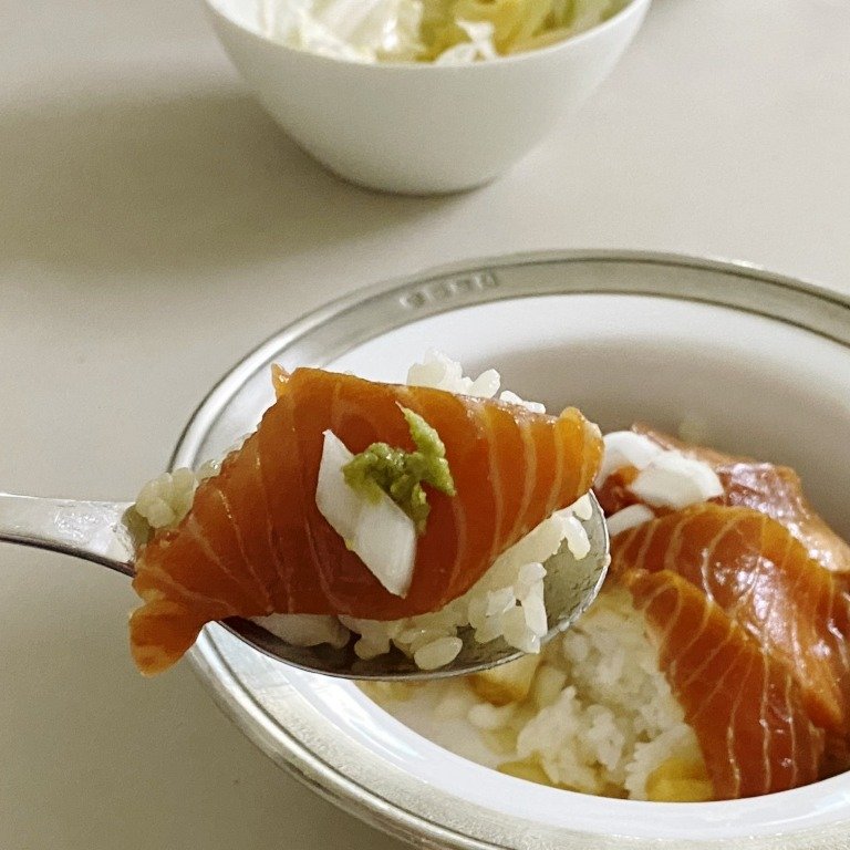 4. 그 위에, 쯔유에 버무려 짭쪼름한 연어를 듬뿍 올려주면 완성!