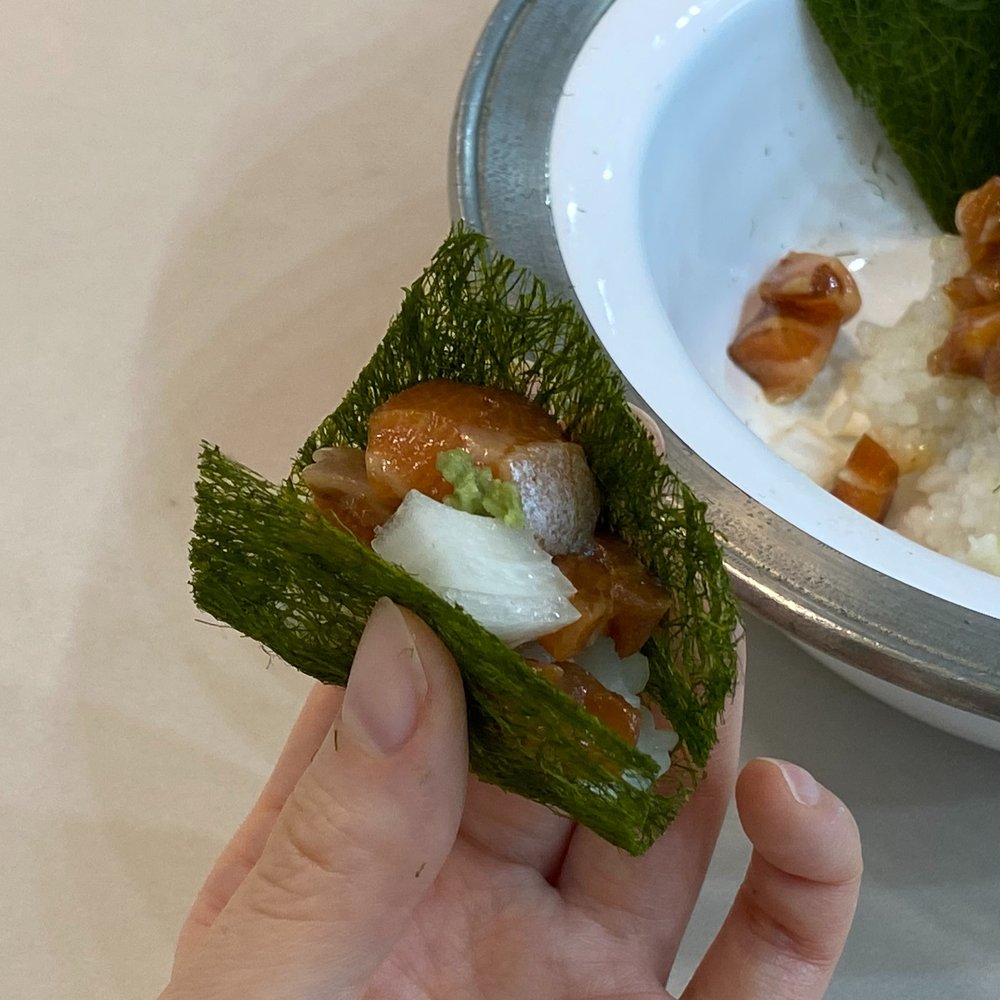 저는 연어를 큼직하니 길게 썰 때도 있고, 작게 썰 때도 있는데요. 감태에 싸 먹고 싶은 날은 잘게 썰어서 감태에 싸 먹어요. 감태 + 양파 + 와사비와 함께 연어장을 밥이랑 싸 먹으면 조합이 정말 좋아요~