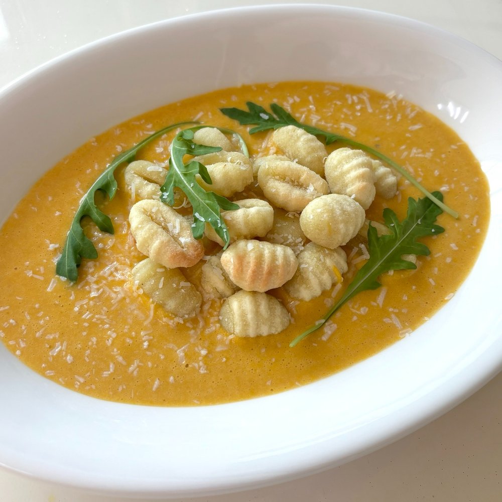 7. 만들어진 단호박 스프를 접시에 담고 구워진 뇨끼를 올려요.