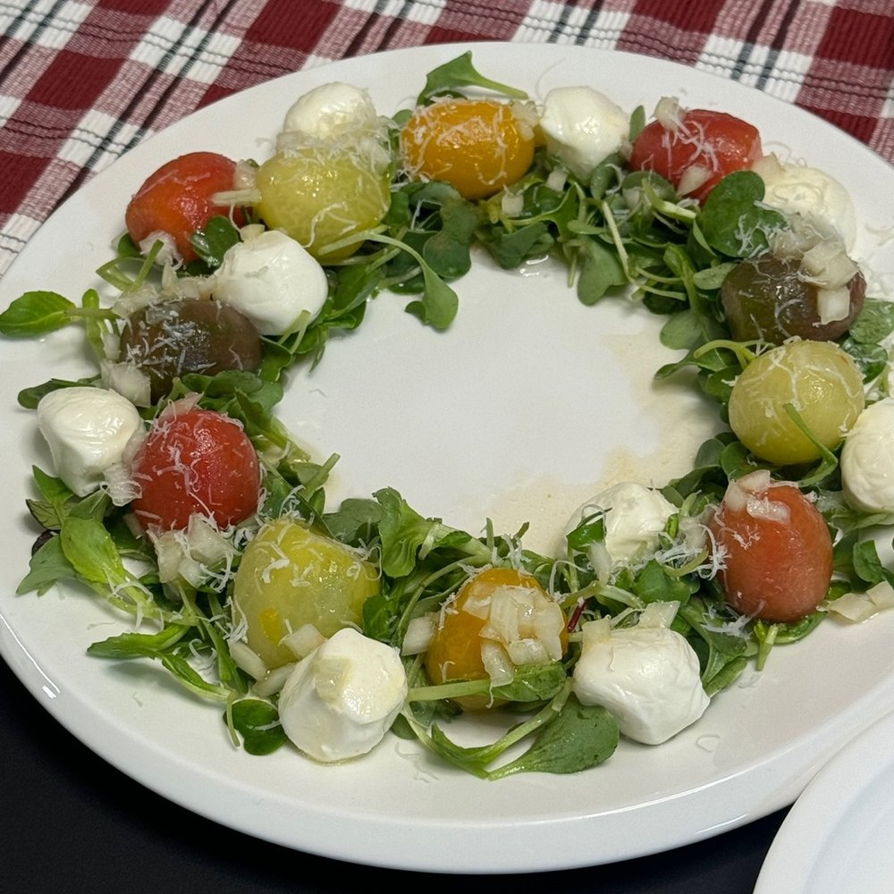 5. 베이비 채소를 깔고, 마리네이드한 토마토와 보코치니 치즈를 예쁘게 배열해 주세요.