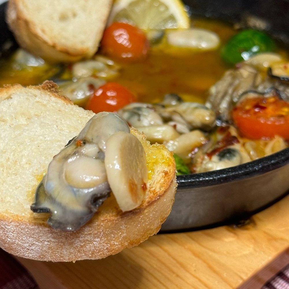 올리브오일에 푹 적셔 익힌 굴은 특유의 비린내는 눈곱만큼도 찾아볼 수 없고, 새우보다 감칠맛은 더 풍부해요.